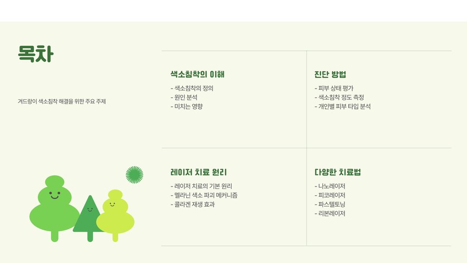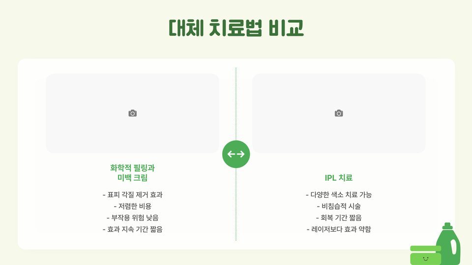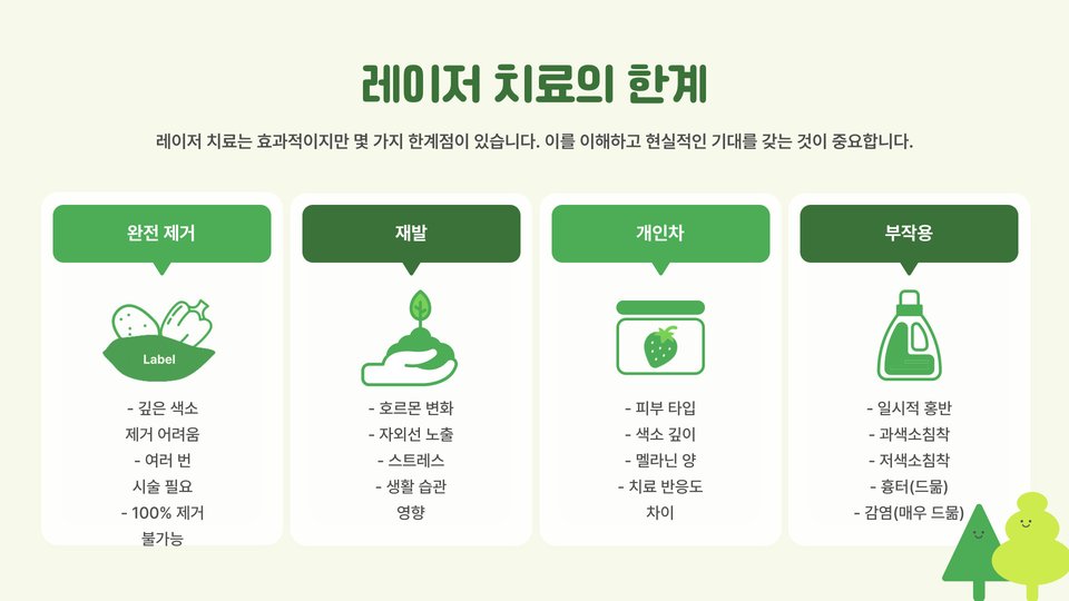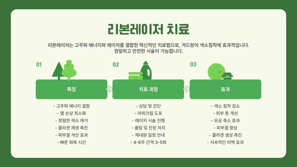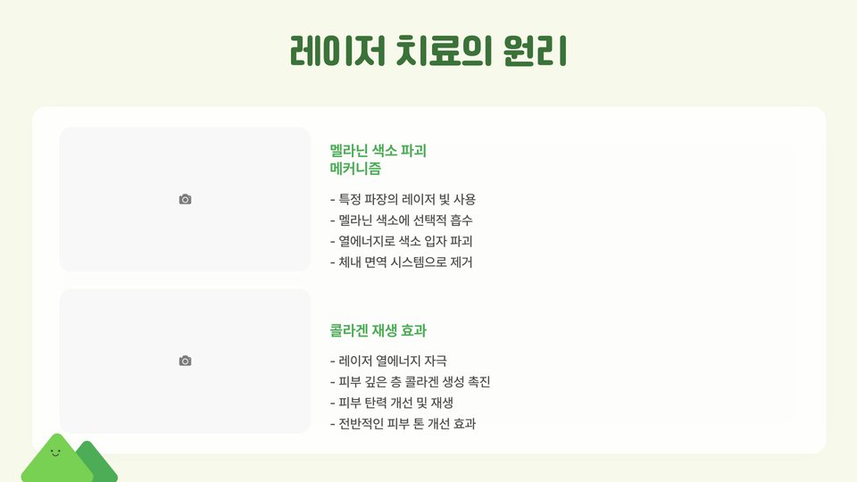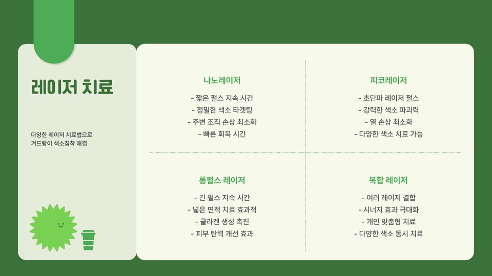 - 레이저 치료는 색소 세포를 선택적으로 파괴하여 고급스러운 피부를 회복합니다.