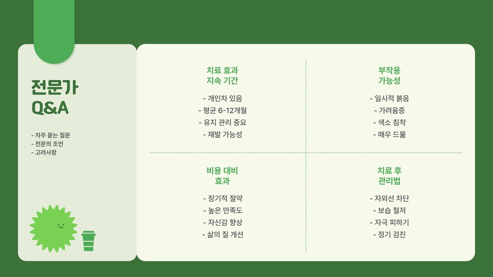 치료를 고려하고 있는 분들은 꼭 전문가와 상담하여 적절한 치료 계획을 세우시길 바랍니다. 여러분의 피부도 건강하고 아름답게 관리될 수 있습니다.