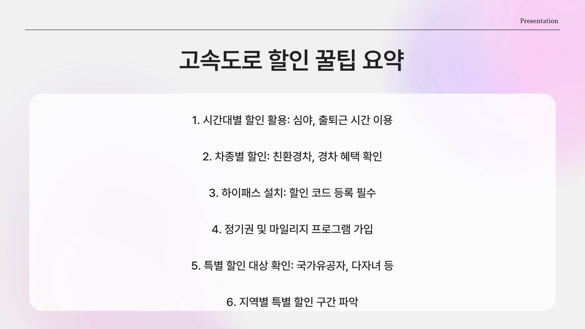 실제 여행 시 이와 같은 팁들을 기억하며 효율적으로 고속도로를 이용하신다면, 보다 즐겁고 경제적인 여행이 가능할 것입니다. 안전한 운전과 든든한 할인 혜택으로 행복한 여행 되세요!