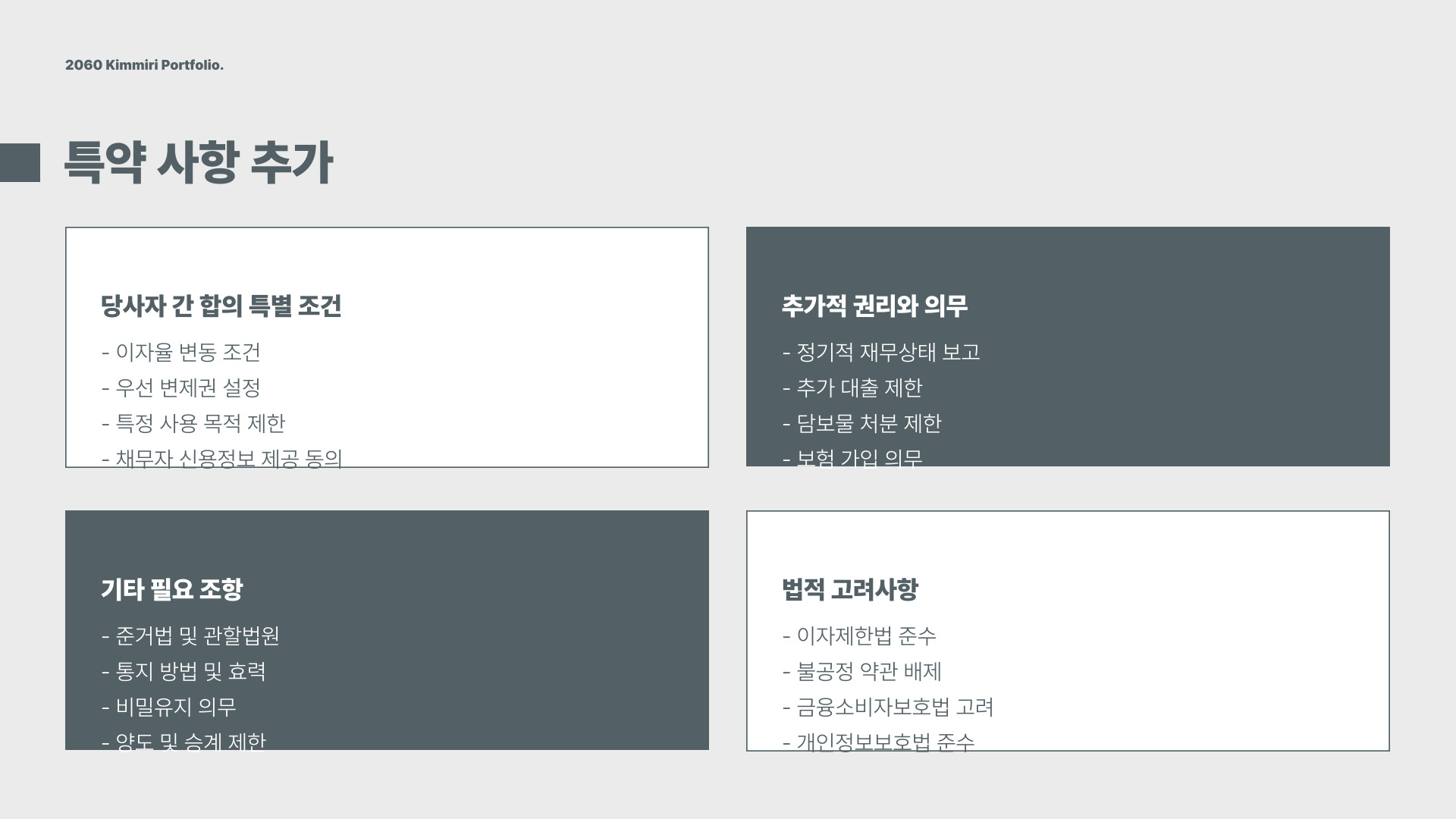 또한, 계약이 끝난 후에도 필요한 기록을 보관하는 것이 좋습니다. 상환이 완료된 후에도 계약서 사본을 보관하여, 나중에 추후 분쟁이 발생할 경우 이를 증빙할 수 있어야 합니다. 단, 계약서 조항에 따라 보관 기간이 다를 수 있으므로 이를 유의하여 관리해야 합니다.