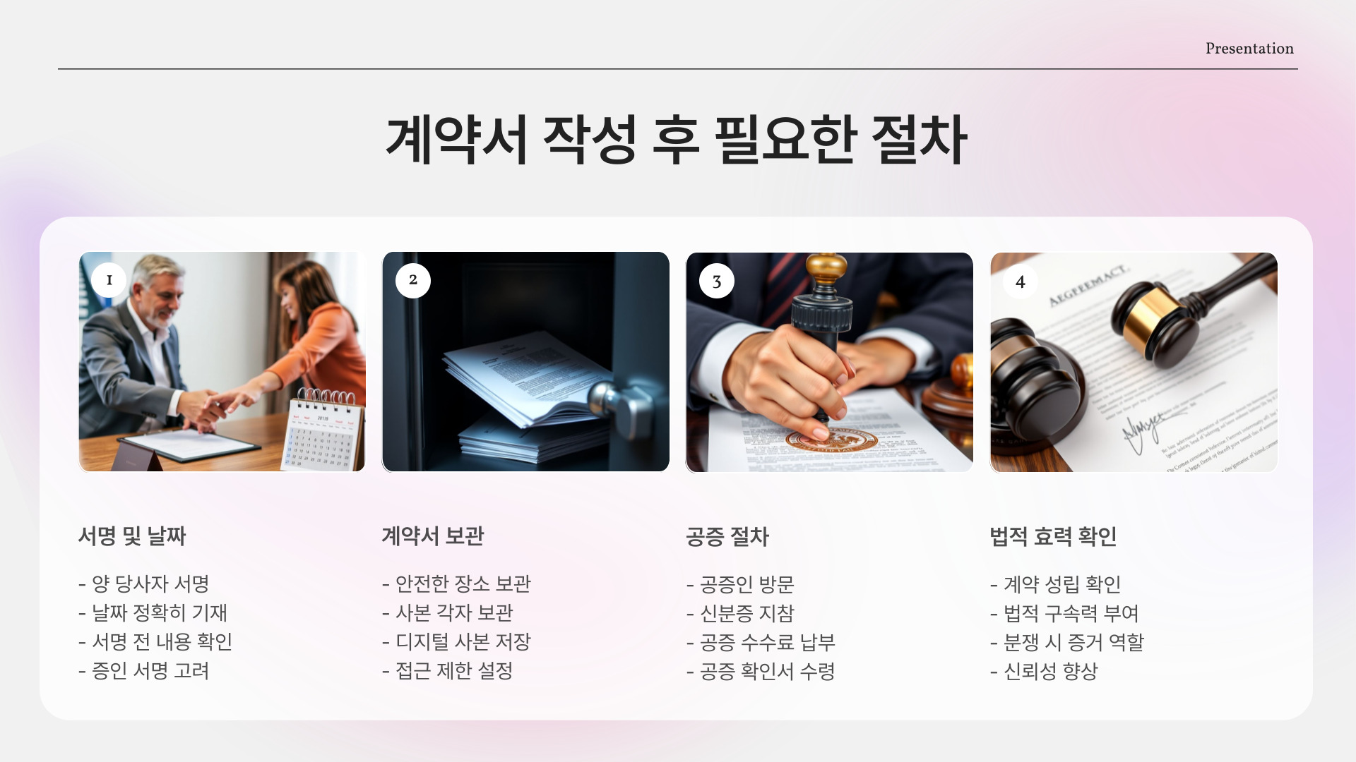 계약서를 작성한 후에는 몇 가지 추가 절차가 필요합니다. 작성한 계약서는 양 당사자가 서명하고 날짜를 기재한 후 보관해야 합니다. 이렇게 함으로써, 계약 내용에 대한 증명력을 높일 수 있습니다. 필요시에는 공증을 받을 수도 있으며, 이는 계약의 법적 효력을 더욱 강화하는 방법입니다.