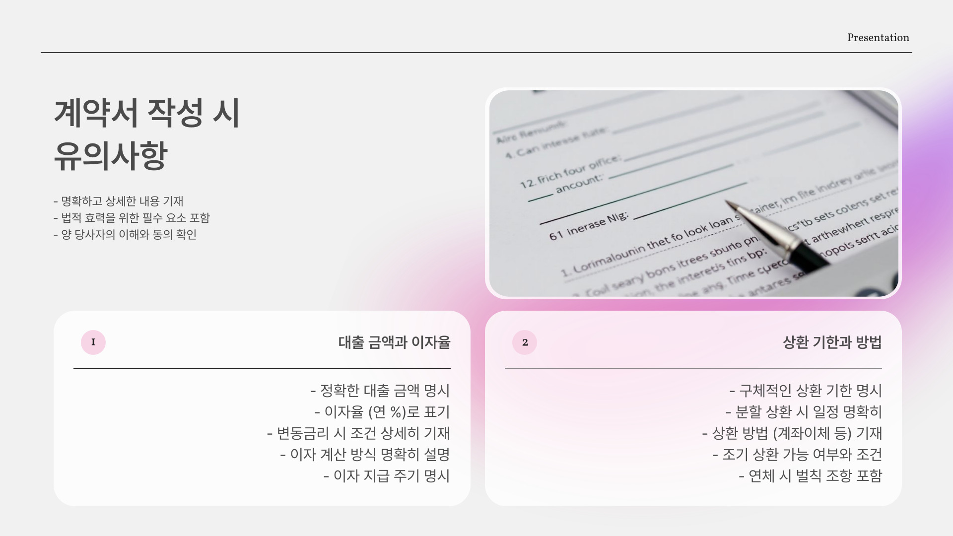 계약서를 작성할 때는 몇 가지 유의해야 할 사항이 있습니다. 첫째, 대출 금액과 이자율을 반드시 명시해야 합니다. 둘째, 상환 기한과 방법을 명확히 해야 하며, 이자 지급일도 포함되어야 합니다. 또한, 연체 시의 벌칙 조항도 사전에 정해 두는 것이 좋습니다. 이러한 세부 사항들은 계약 이행 시 발생할 수 있는 불필요한 분쟁을 예방하는 데 큰 도움이 됩니다.