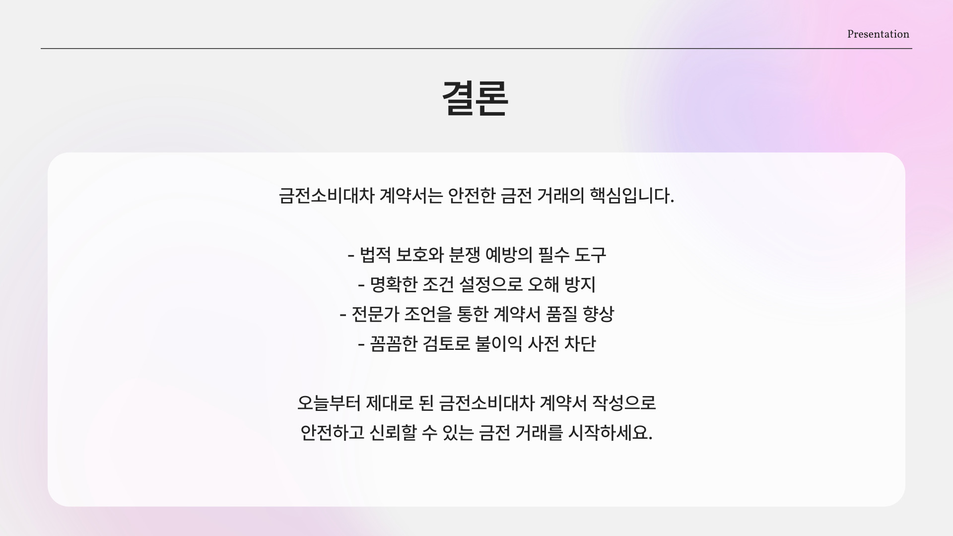 금전소비대차 계약서는 금전 거래에서 가장 중요한 문서 중 하나입니다. 적절한 양식으로 계약서를 작성하고, 모든 조건을 명확히 하는 것만으로도 향후 발생할 수 있는 분쟁을 예방할 수 있습니다. 오늘부터 시작하여, 안전하고 신뢰할 수 있는 금전 거래를 위한 첫걸음을 내딛어 보세요!