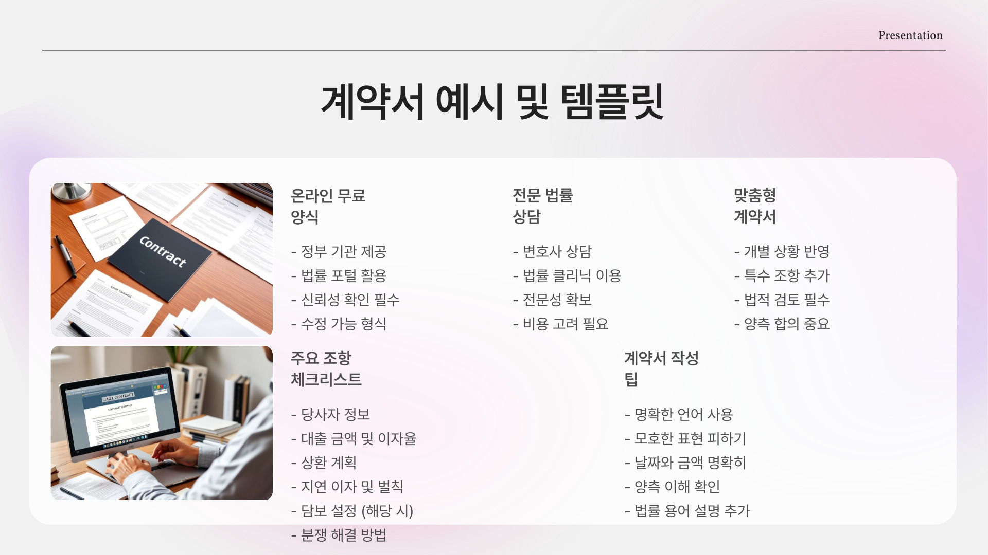 금전소비대차 계약서를 작성할 때 참고할 수 있는 예시와 템플릿은 다양합니다. 인터넷에서 무료로 제공되는 양식을 활용하거나, 전문 법률 상담을 통해 맞춤형 계약서를 작성할 수도 있습니다. 전문가의 도움을 받는 것이 더욱 안전한 거래를 보장하는 방법입니다.