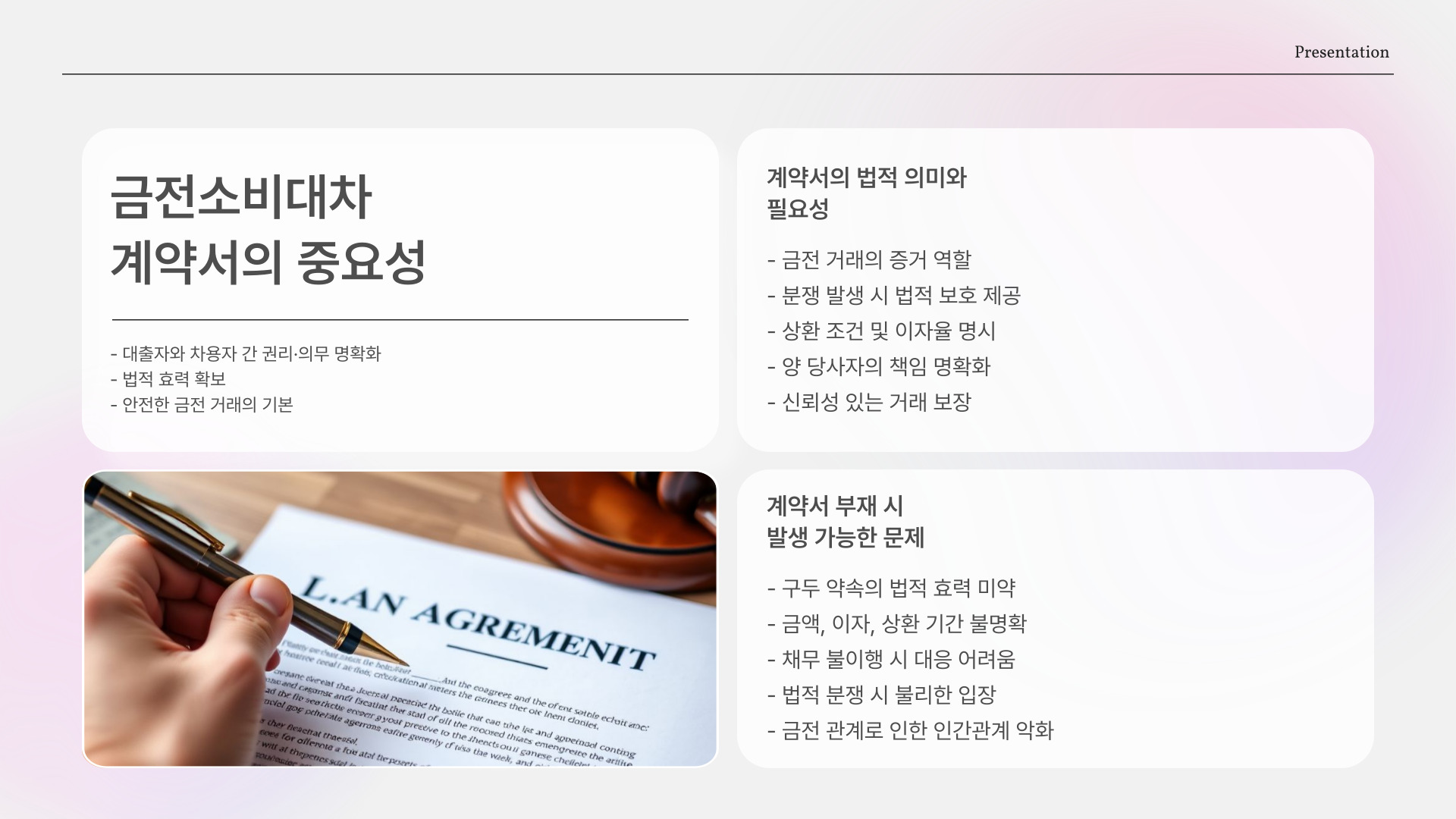 Tags: 금전소비대차, 계약서 양식, 대출, 차용, 법적 효력, 거래 안전, 서명, 이자율, 상환 기한, 벌칙 조항