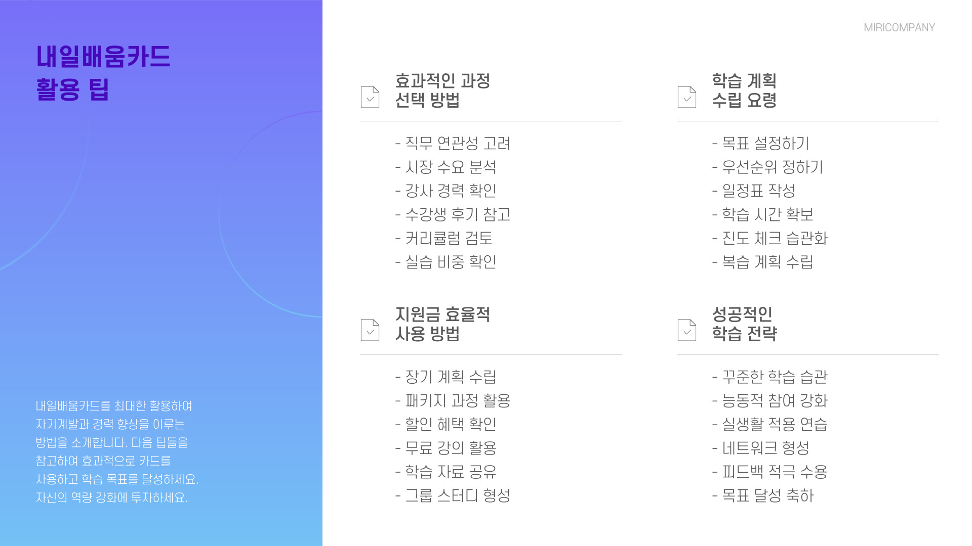 마지막으로, 카드 사용과 관련된 모든 절차의 안내는 고용노동부 홈페이지에서도 확인할 수 있으니 꼭 방문하여 충분히 이용하세요. 무엇보다도 이 카드를 통해 얻은 경험과 지식을 잘 활용하셔서 직장에서의 성장을 이루는 것이 중요합니다.