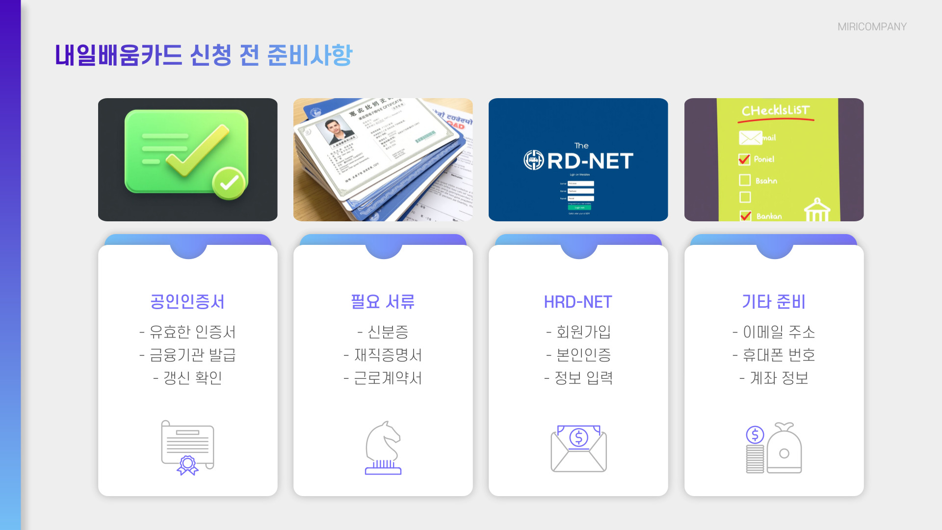 내일배움카드를 신청하기 위해서는 몇 가지 준비물이 필요합니다. 첫째, 신분증을 준비해야 하며, 둘째, 현재 재직 중인 회사의 재직증명서가 필요합니다. 셋째, 교육을 받으려는 기관의 정보가 필요하므로 미리 알아두는 것이 좋습니다. 이러한 준비물을 갖추면 신청 과정이 한층 수월해집니다.