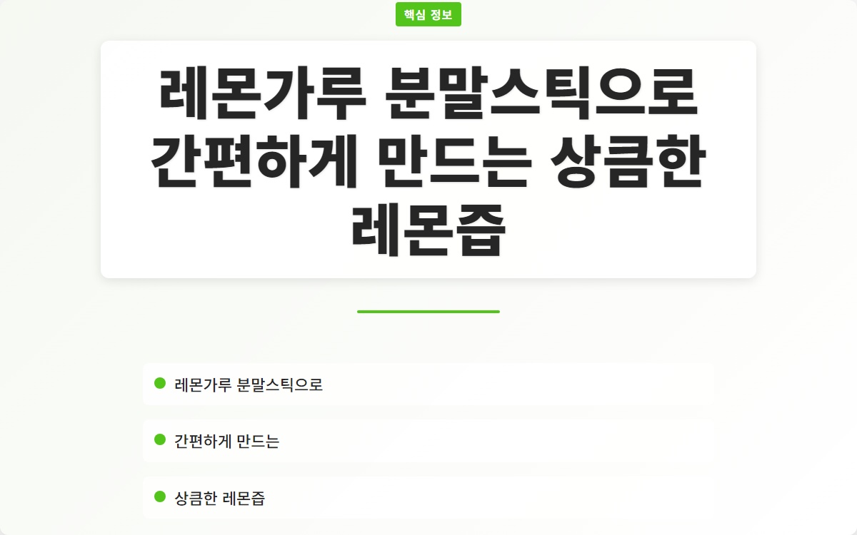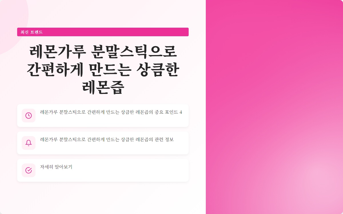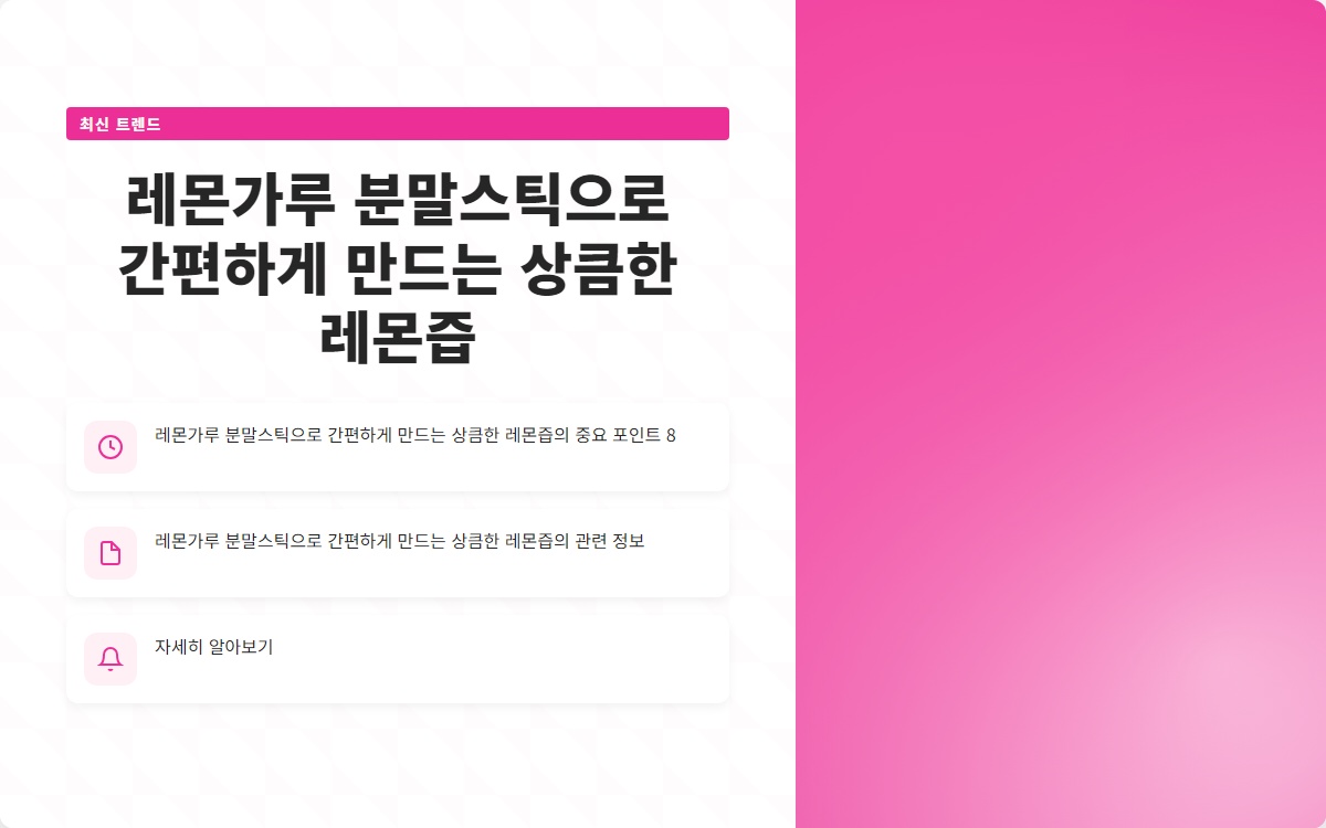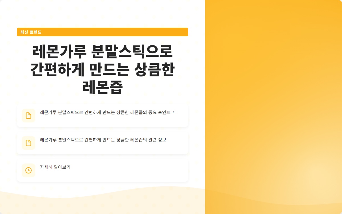 레몬은 상큼한 맛과 건강에 좋은 성분으로 많은 사랑을 받고 있습니다. 하지만 신선한 레몬을 자주 구매하고 보관하는 것은 쉽지 않죠. 레몬가루 분말스틱을 활용하면 간편하게 상큼한 레몬즙을 만들 수 있습니다. 어떤 방법인지 궁금하지 않으신가요? 이번 포스팅에서 그 방법을 소개합니다!