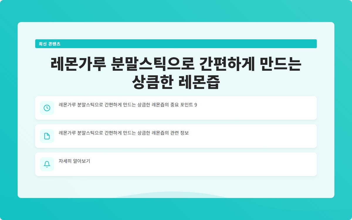 1. 레몬가루 분말스틱을 활용하면 신선한 레몬 없이도 레몬즙을 만들 수 있다. 2. 보관이 용이하고 여러 가지 요리에 활용할 수 있다. 3. 간단한 단계로 쉽게 만들 수 있다. 이제 여러분도 레몬가루 분말스틱으로 상큼한 레몬즙을 만들어 보세요! 궁금한 점이 있다면 댓글로 남겨주세요.