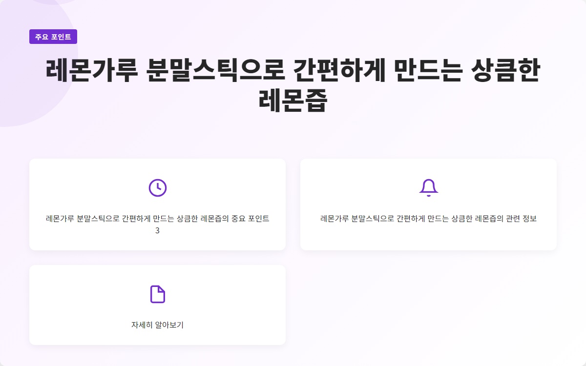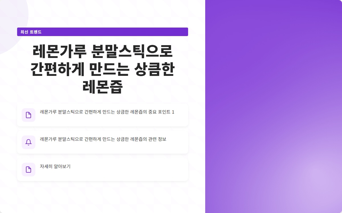 1. **재료 준비하기**: 레몬가루 분말스틱, 물, 원하는 경우 설탕이나 꿀을 준비합니다. 2. **혼합하기**: 컵에 레몬가루 분말스틱을 적당량 넣고, 물을 부어 잘 저어줍니다. 필요에 따라 설탕이나 꿀을 추가해도 좋습니다. 3. **완성하기**: 모든 재료가 잘 섞이면, 상큼한 레몬즙이 완성됩니다. 얼음을 추가하면 더욱 시원하게 즐길 수 있습니다. 이 방법은 간단하면서도 빠르게 상큼한 레몬즙을 만들어줄 수 있습니다. 또한, 여러 가지 음료와 요리에 활용할 수 있어 더욱 유용합니다. ---