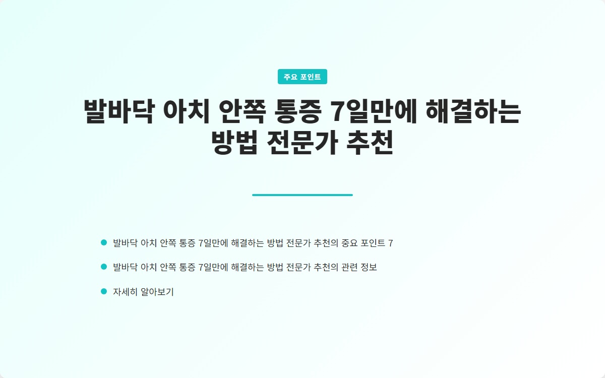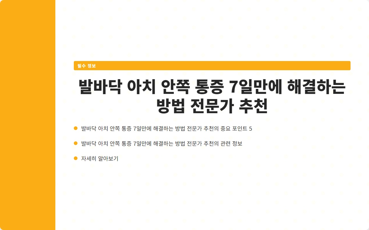 발바닥 아치 안쪽 통증은 많은 사람들에게 고통을 주지만, 전문가가 추천하는 방법을 따르면 7일 만에 개선할 수 있습니다. 통증의 원인을 파악하고, 단계별 해결책을 실천하면 여러분도 편안한 일상으로 돌아갈 수 있습니다.