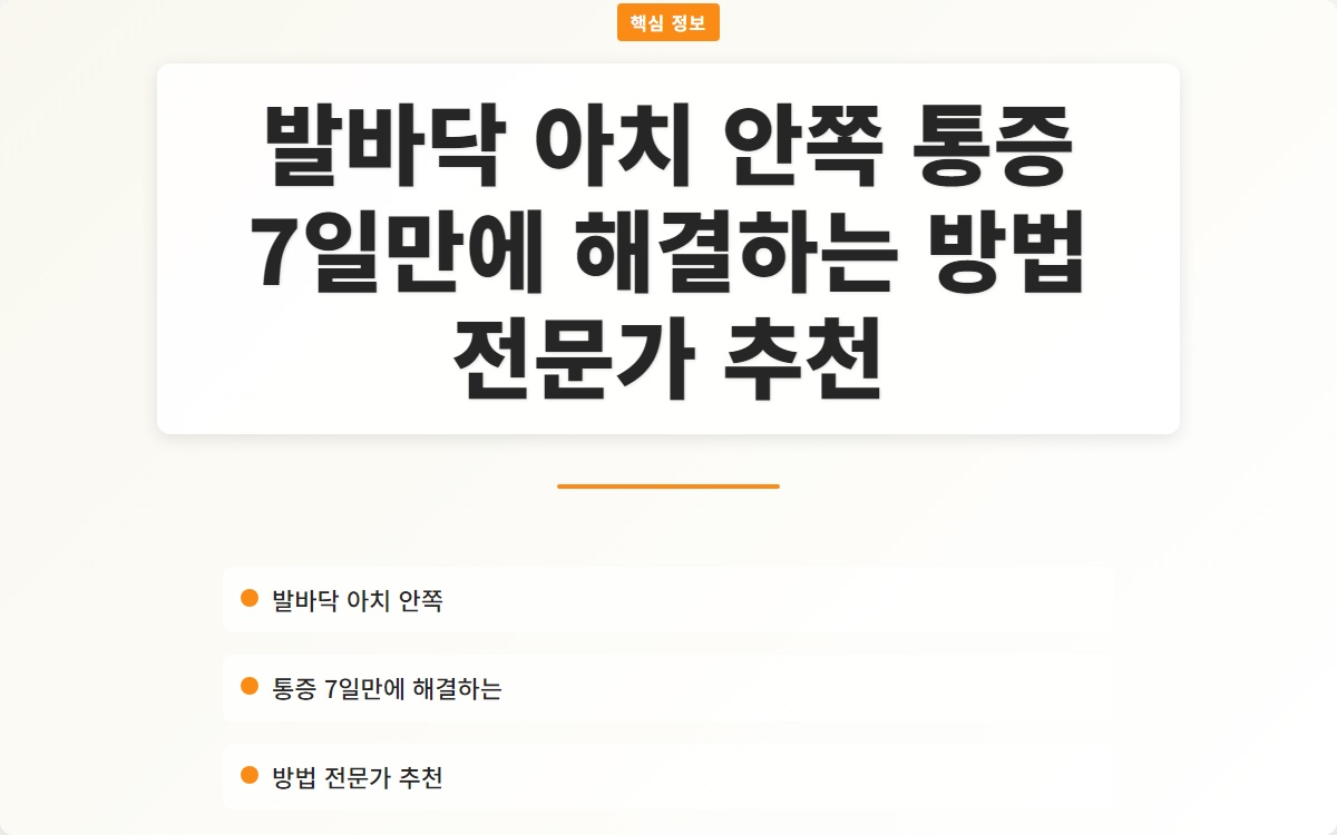 이 방법들을 7일 동안 실천하면 발바닥 아치 안쪽 통증을 효과적으로 완화할 수 있습니다. 실제로 많은 환자들이 이 방법을 통해 통증을 줄이고 일상생활로 돌아갔습니다.