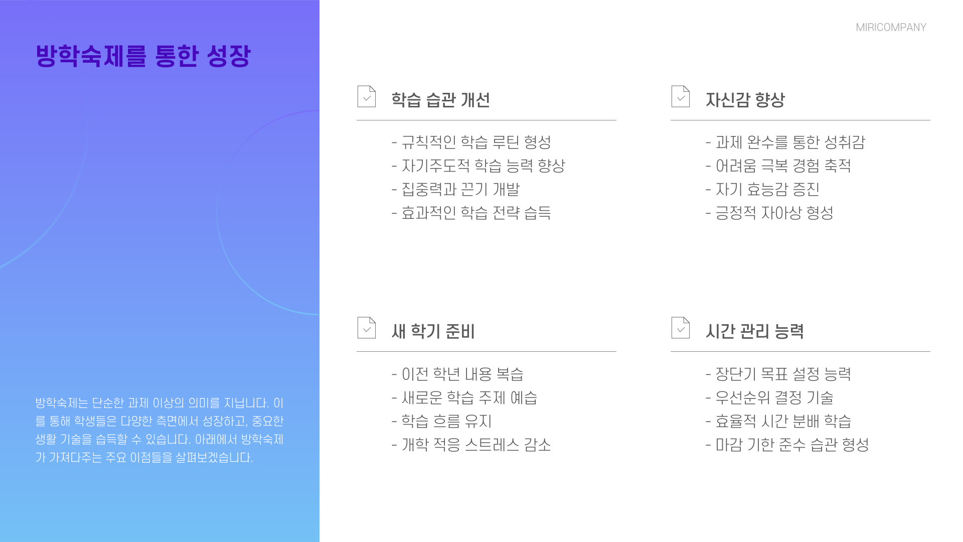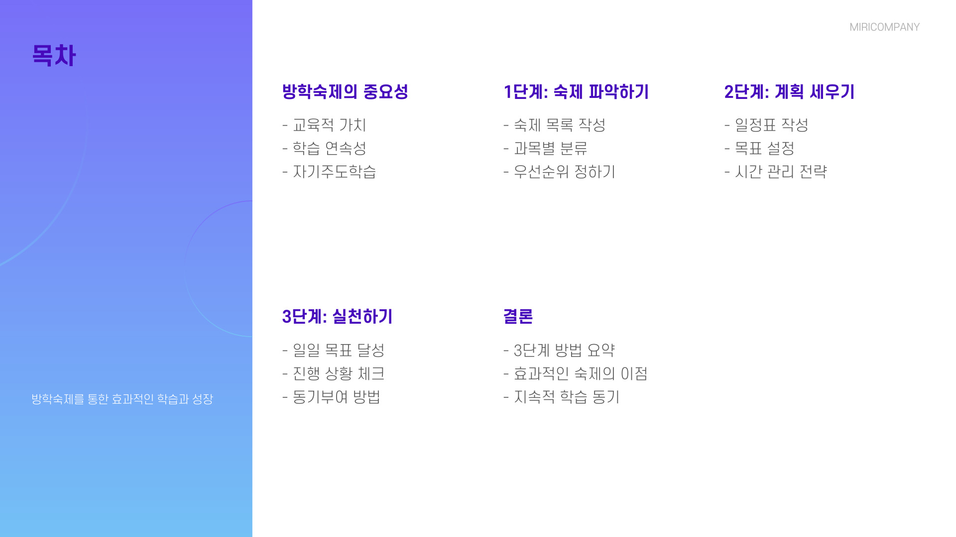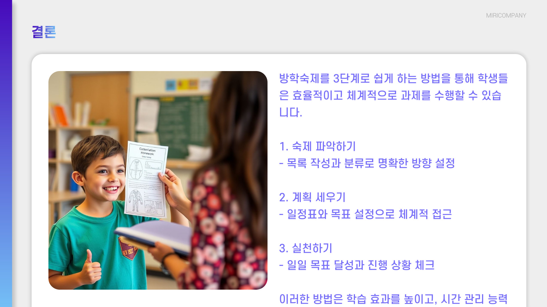 이상의 내용을 정리해보면, 방학숙제를 쉽게 할 수 있는 3단계는 계획하기, 작업 나누기, 검토 및 피드백 받기로 나뉘며, 각 단계를 통해 학생들은 방학을 더욱 의미 있게 보낼 수 있습니다. 이제 방학숙제를 두려워하지 말고, 더 알차게 활용해보세요!
