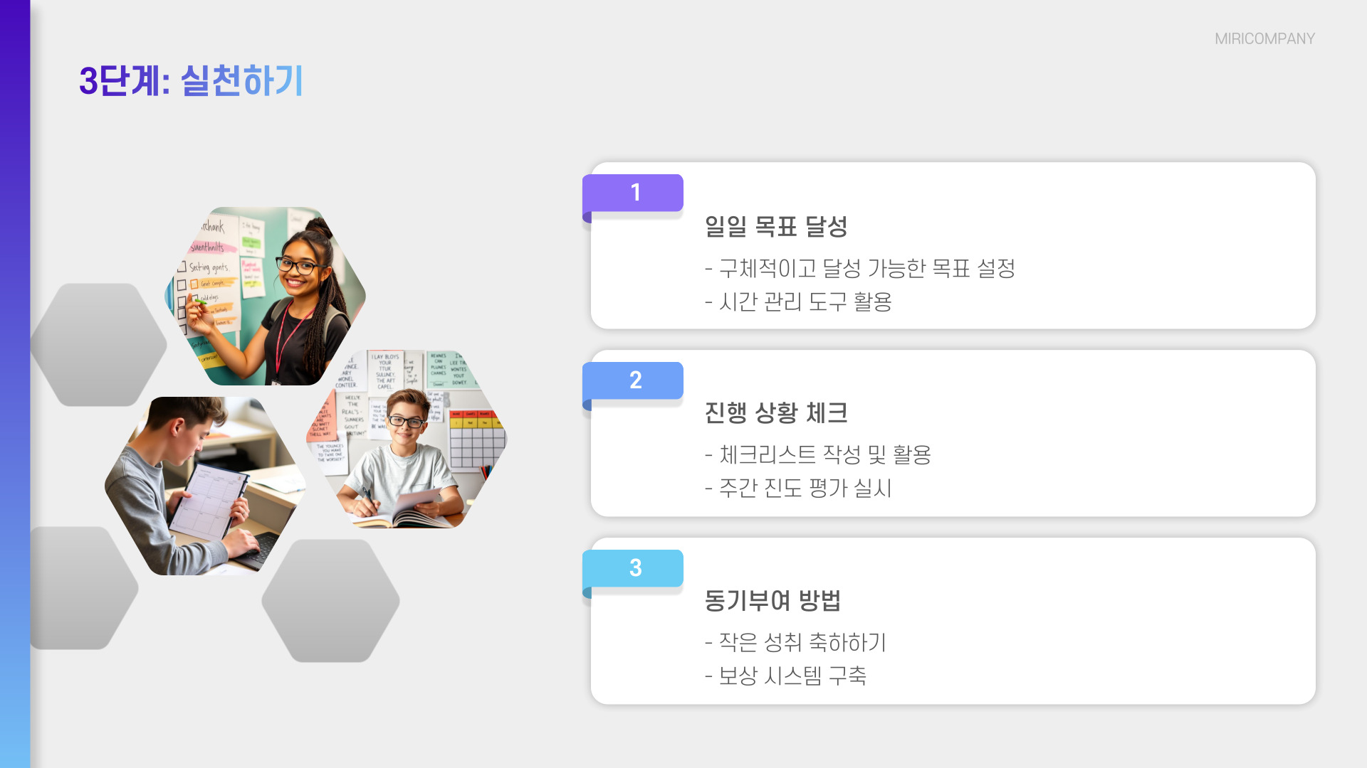 마지막으로 계획은 세운 후, 학생 스스로 동기부여를 할 수 있는 방법을 고민해 보세요. 업적을 시각화하는 차트를 만들거나 친구들과 함께 스터디 그룹을 구성하는 것도 좋은 방법입니다. 이를 통해 방학숙제를 좀 더 즐겁게 수행할 수 있을 것입니다.
