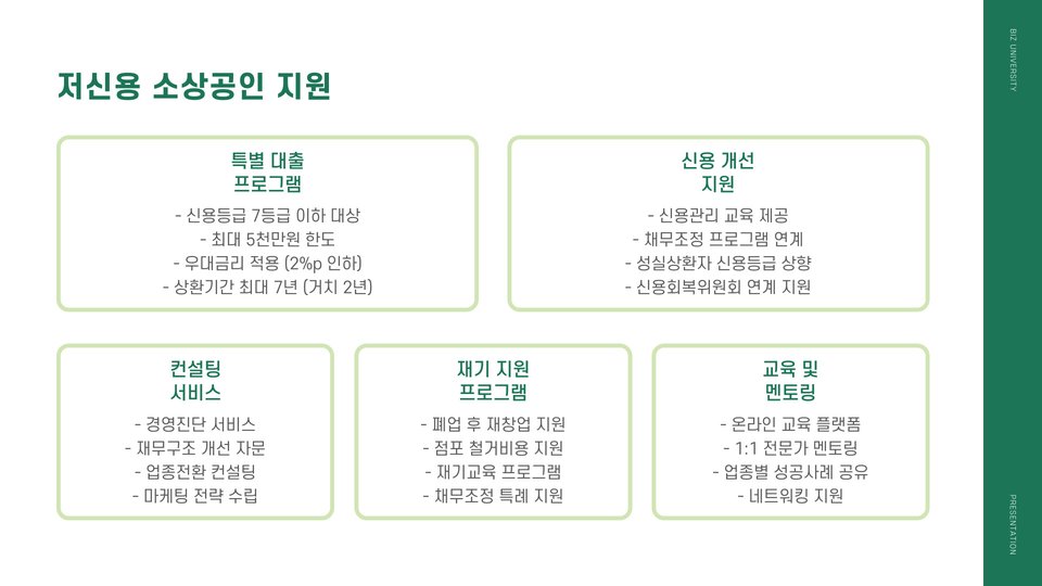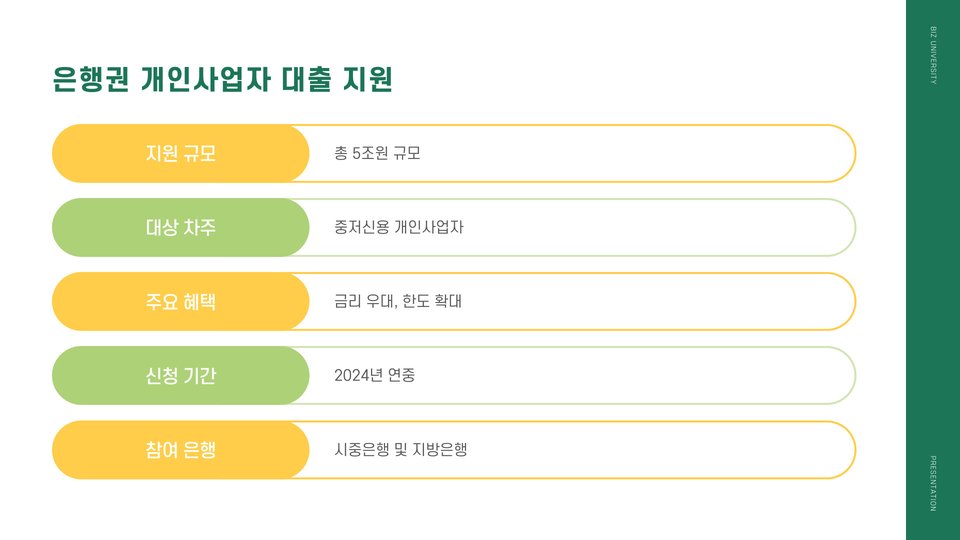 이 외에도, 정부의 정책적 지원이 대출 시장에 긍정적인 영향을 미치고 있습니다. 정부는 특정 업종에 대해 저금리 대출을 제공하여 소상공인들이 더 나은 환경에서 사업을 운영할 수 있도록 돕고 있습니다. 이러한 정책은 특히 어려운 상황에 놓인 소상공인들에게 큰 도움이 됩니다.