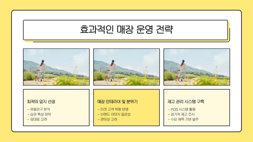 두 번째로 중요한 것은 효율적인 경영 전략입니다. 소상공인은 자금과 인력이 제한적이기 때문에, 경비를 줄이면서도 매출을 극대화할 방법을 찾아야 합니다. 이를 위해 원가 절감, 고객 관리, 마케팅 세 가지 요소에 집중해야 합니다.