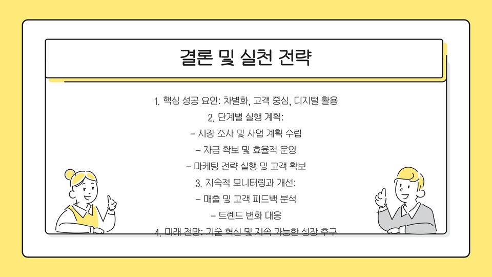 독자 여러분이 소개된 방법들을 통해 자신의 소상공인 사업을 더욱 성공적으로 이끌어 나가기를 바랍니다. 앞서 언급했던 전략들을 가볍게 스쳐 지나가지 말고, 하나하나 실천해 나가길 기대합니다.