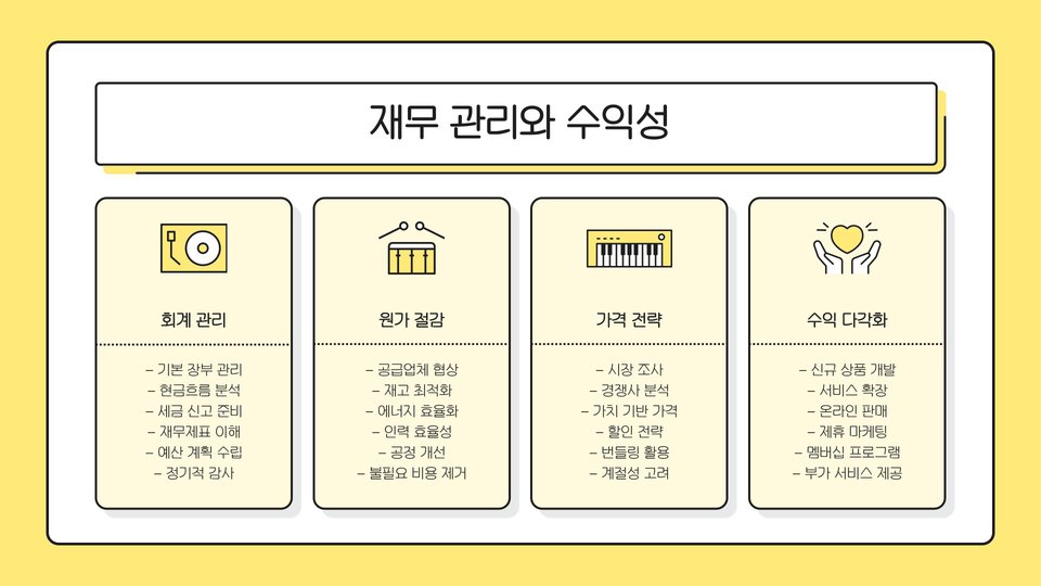 재정 관리는 소상공인에게 있어 생존과 직결된 중요한 요소입니다. 수입과 지출을 철저히 기록하고, 예산을 수립함으로써 재정 상태를 명확히 파악해야 합니다. 또한, 비용 절감 방안을 모색하여 무의미한 지출을 줄이는 것이 필수적입니다.