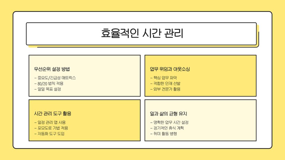 효율적인 자원 활용도 중요합니다. 인력, 시간, 물자 등의 자원을 최대한 활용하여 생산성을 높이는 방안을 찾아야 합니다. 예를 들어, 자동화 기술을 도입하면 인력 비용을 줄이고, 업무의 효율성을 높일 수 있습니다.