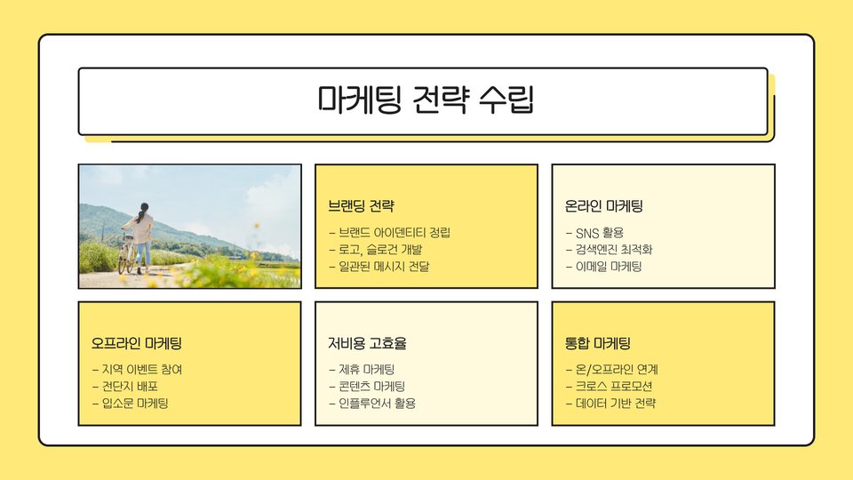 마케팅 전략도 빼놓을 수 없는 요소입니다. SNS와 같은 디지털 플랫폼을 활용하여 저비용으로 넓은 고객층에 접근할 수 있습니다. 중요한 점은 각 채널의 특성을 이해하고, 그에 맞는 콘텐츠를 제작하는 것입니다.