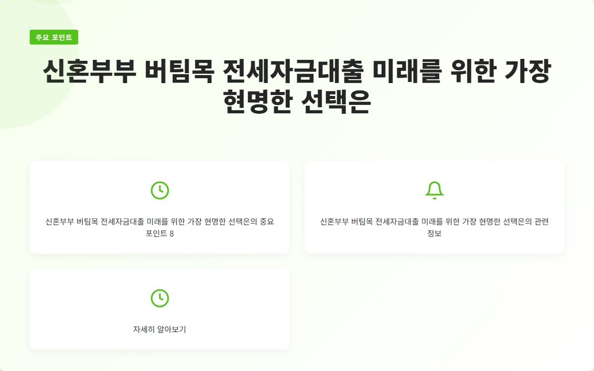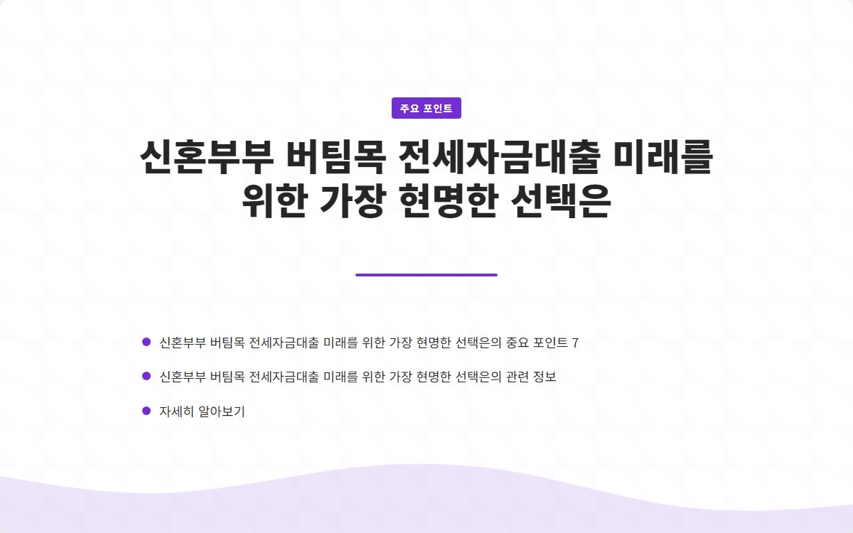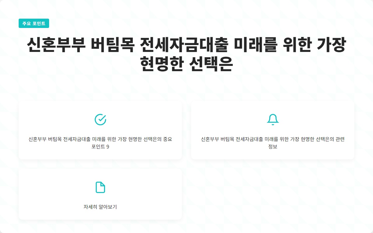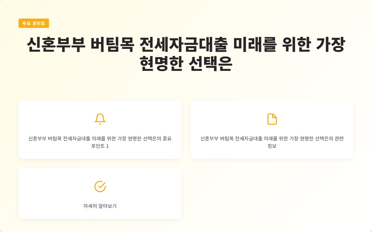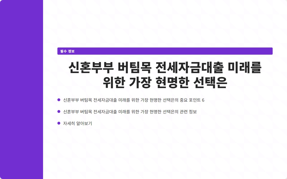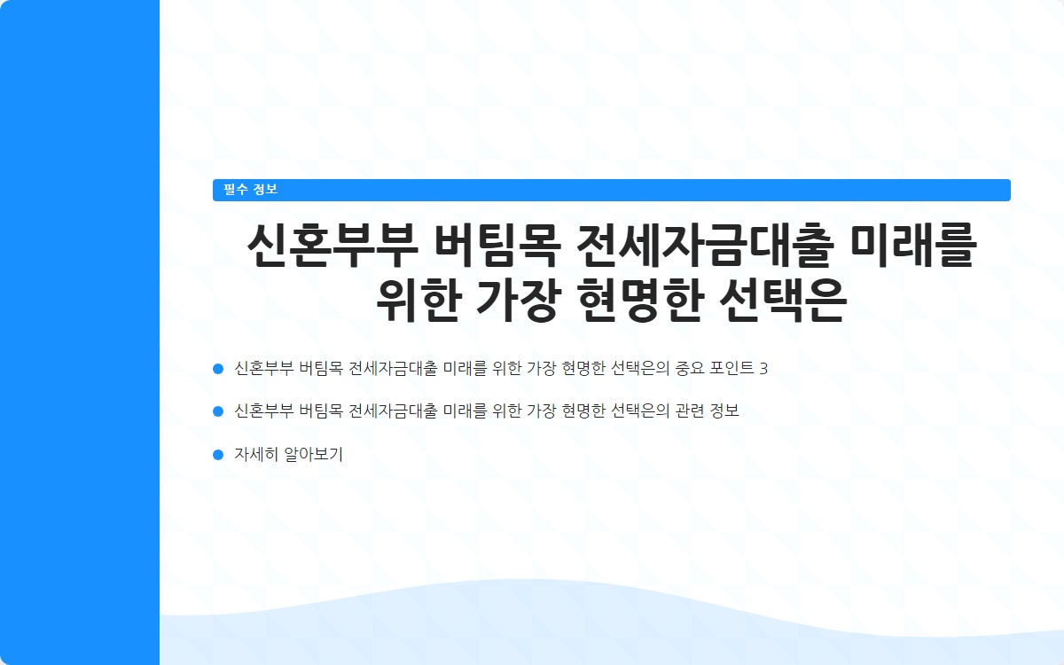 신혼부부가 집을 마련하는 과정은 언제나 쉽지 않습니다. 막대한 전세금과 월세 부담이 가중되는 시대에, 많은 부부들이 고민하고 있는 상황입니다. 당신도 이러한 문제에 직면해 있나요? 오늘은 신혼부부에게 최적화된 버팀목 전세자금 대출에 대해 알아보겠습니다. 이 글을 통해 현명한 결정의 길을 찾아보세요.
