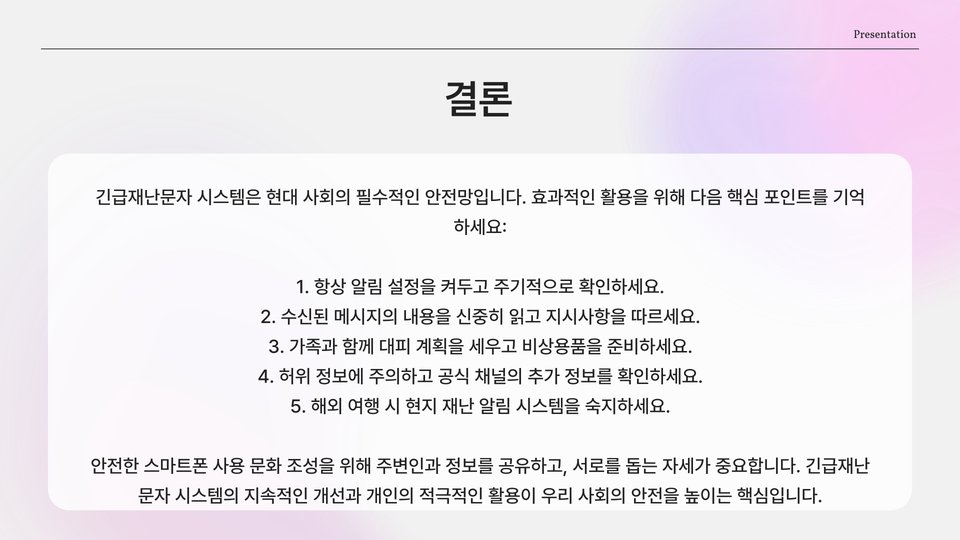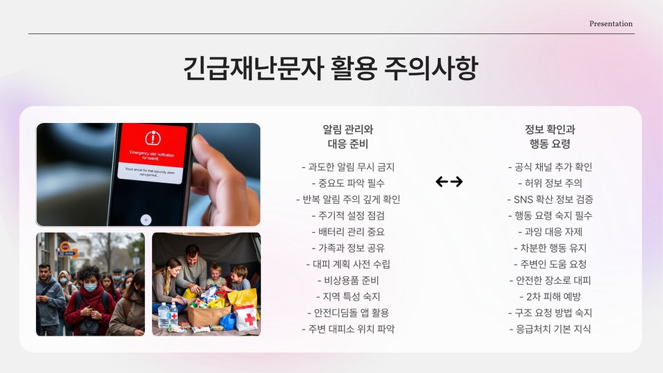 또한, 긴급재난문자는 국가 재난 관리 시스템의 일환으로 운영되므로, 모든 사용자들은 이 내용을 숙지하고 있어야 합니다.