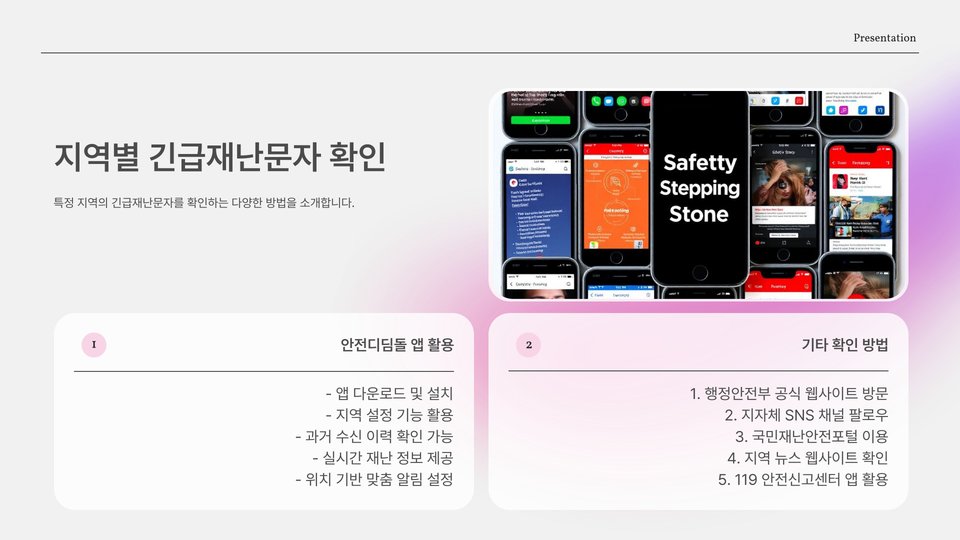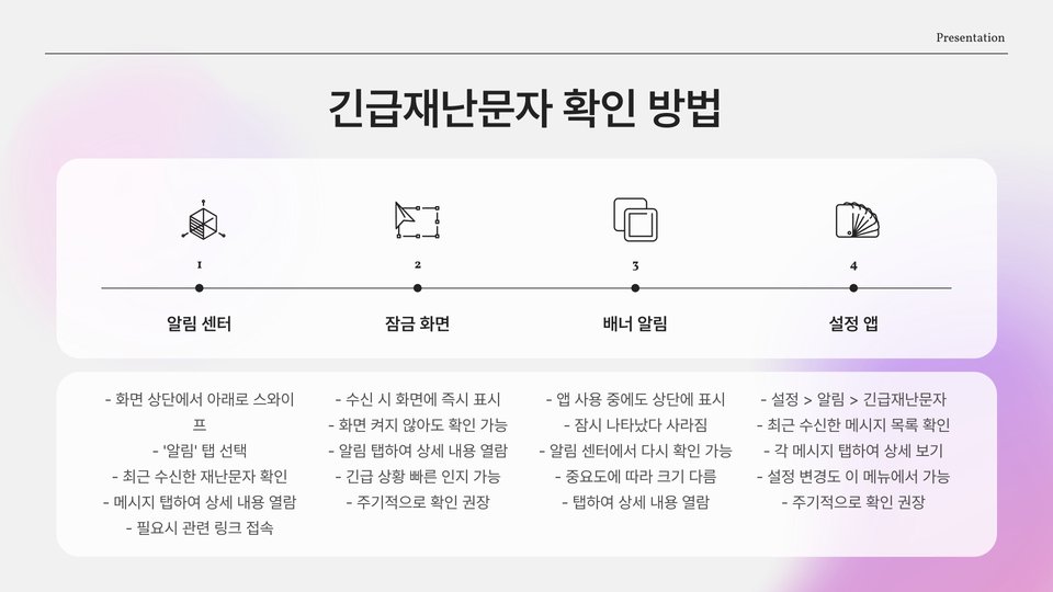 추가적으로, 긴급재난문자는 수신 시 화면에 큰 알림으로 표시되므로, 이를 통해 신속하게 상황을 파악할 수 있습니다. 이러한 기능을 통해 안전을 더욱 강화할 수 있습니다.