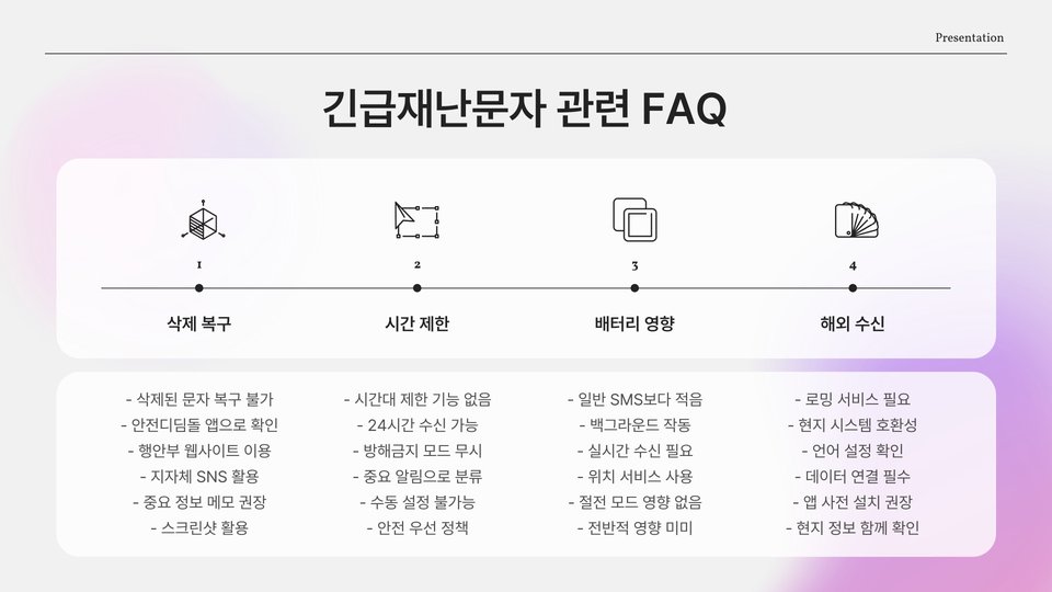 또한, 긴급재난문자는 국가 재난 관리 시스템의 일환으로 운영되므로, 모든 사용자들은 이 내용을 숙지하고 있어야 합니다.