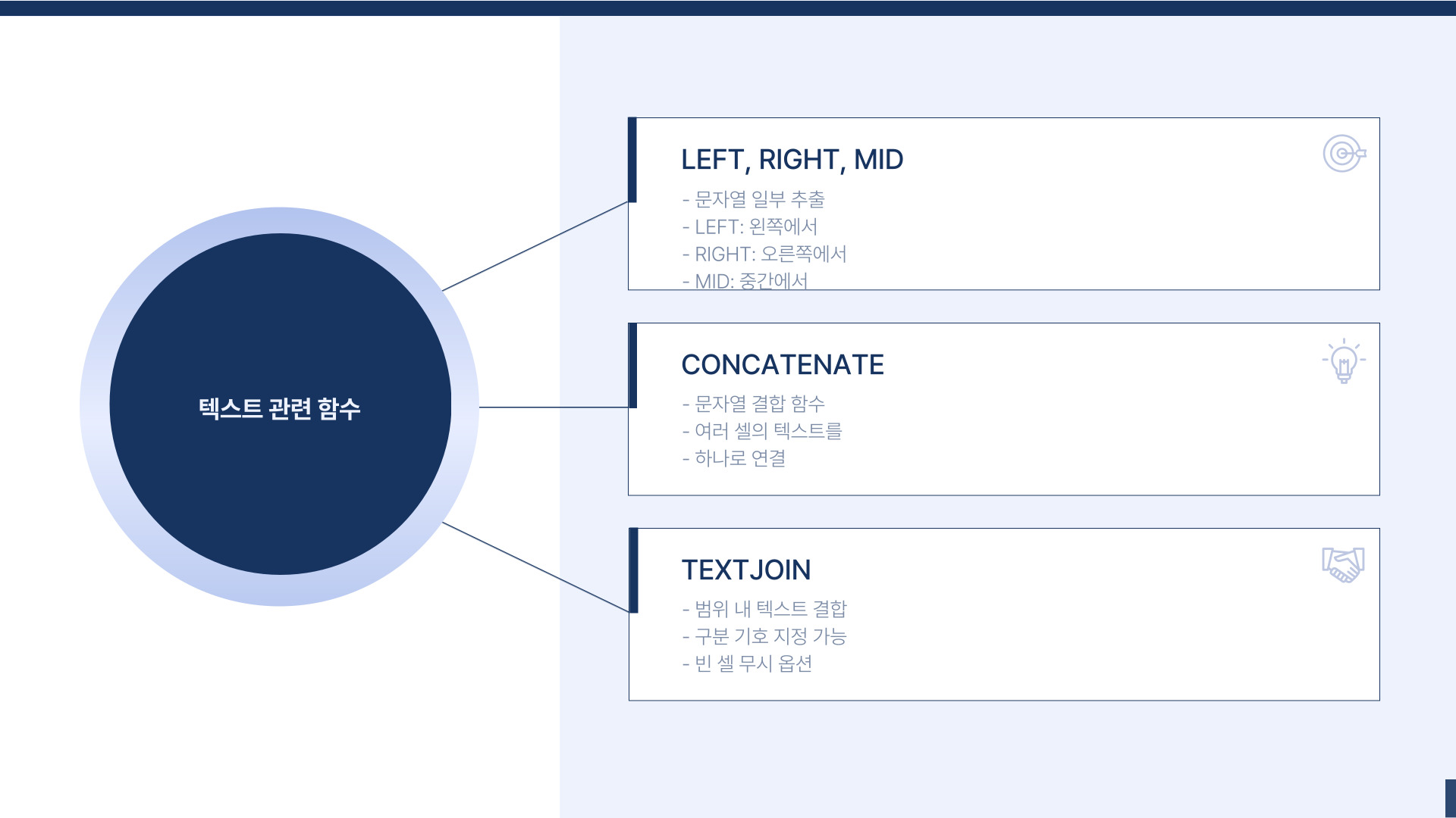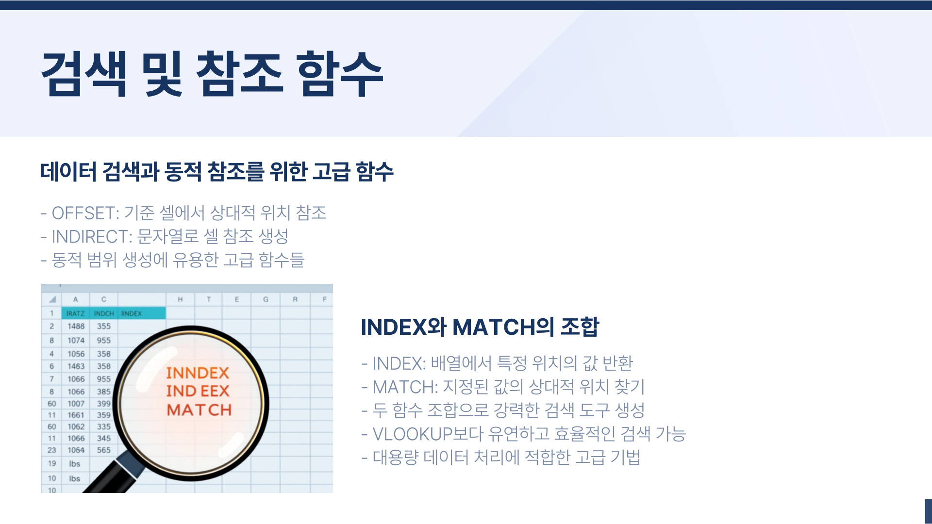 | VLOOKUP | 동일한 행에서 특정 값을 찾아 반환함 | VLOOKUP(A2, B1:C10, 2, FALSE) |