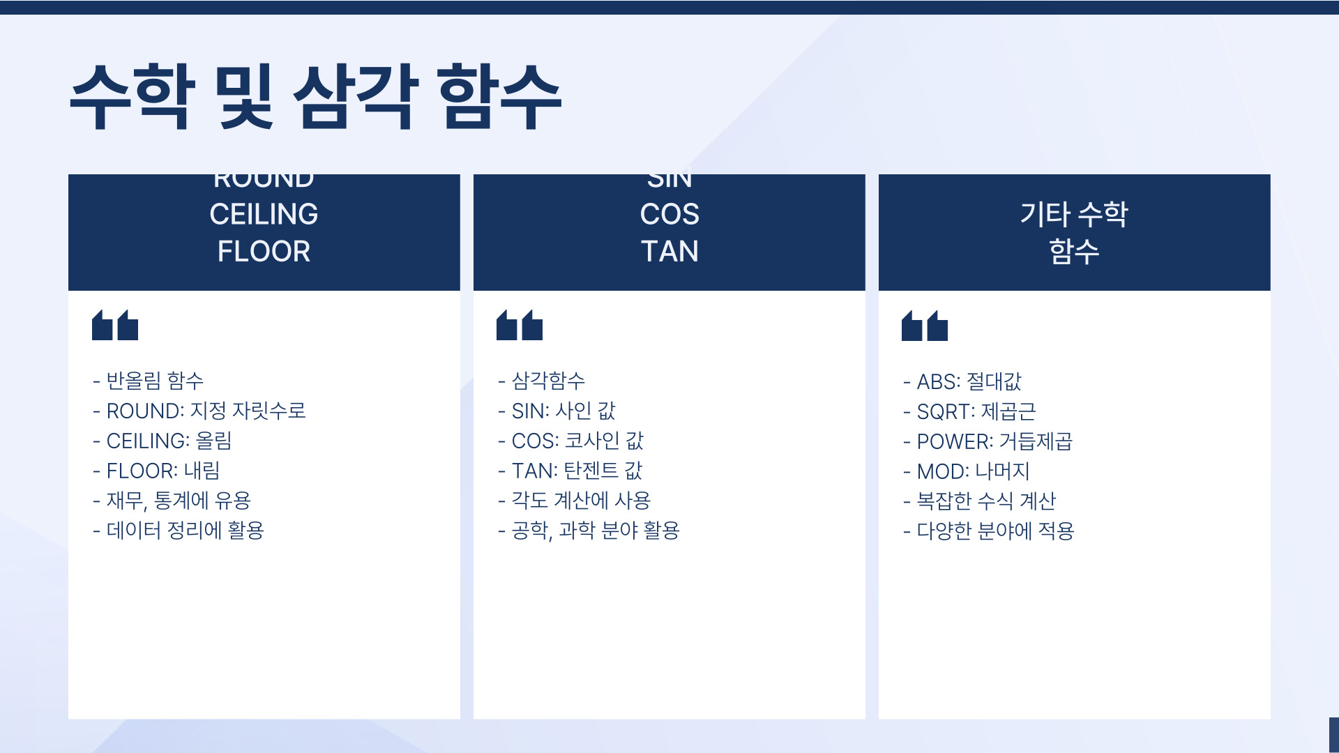 | SUM | 지정된 셀의 값의 합을 구함 | SUM(A1:A10) |