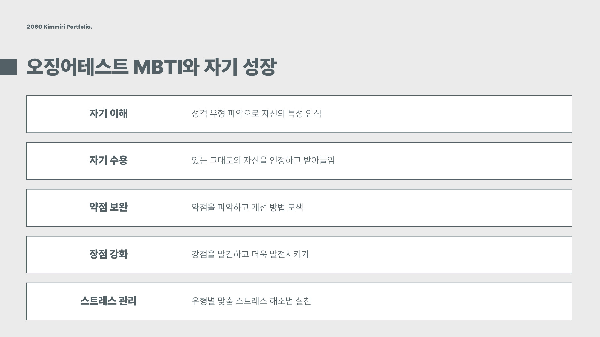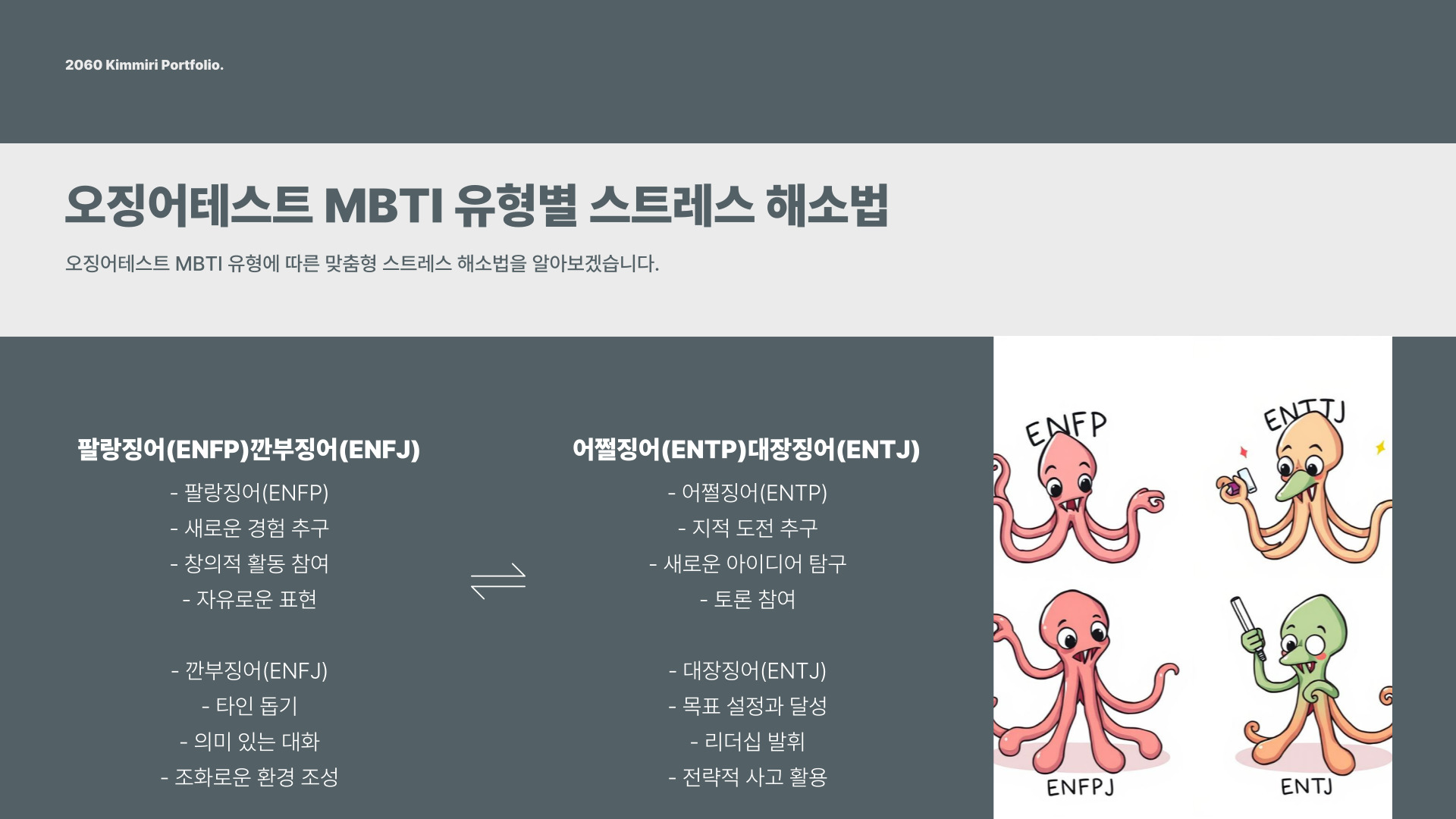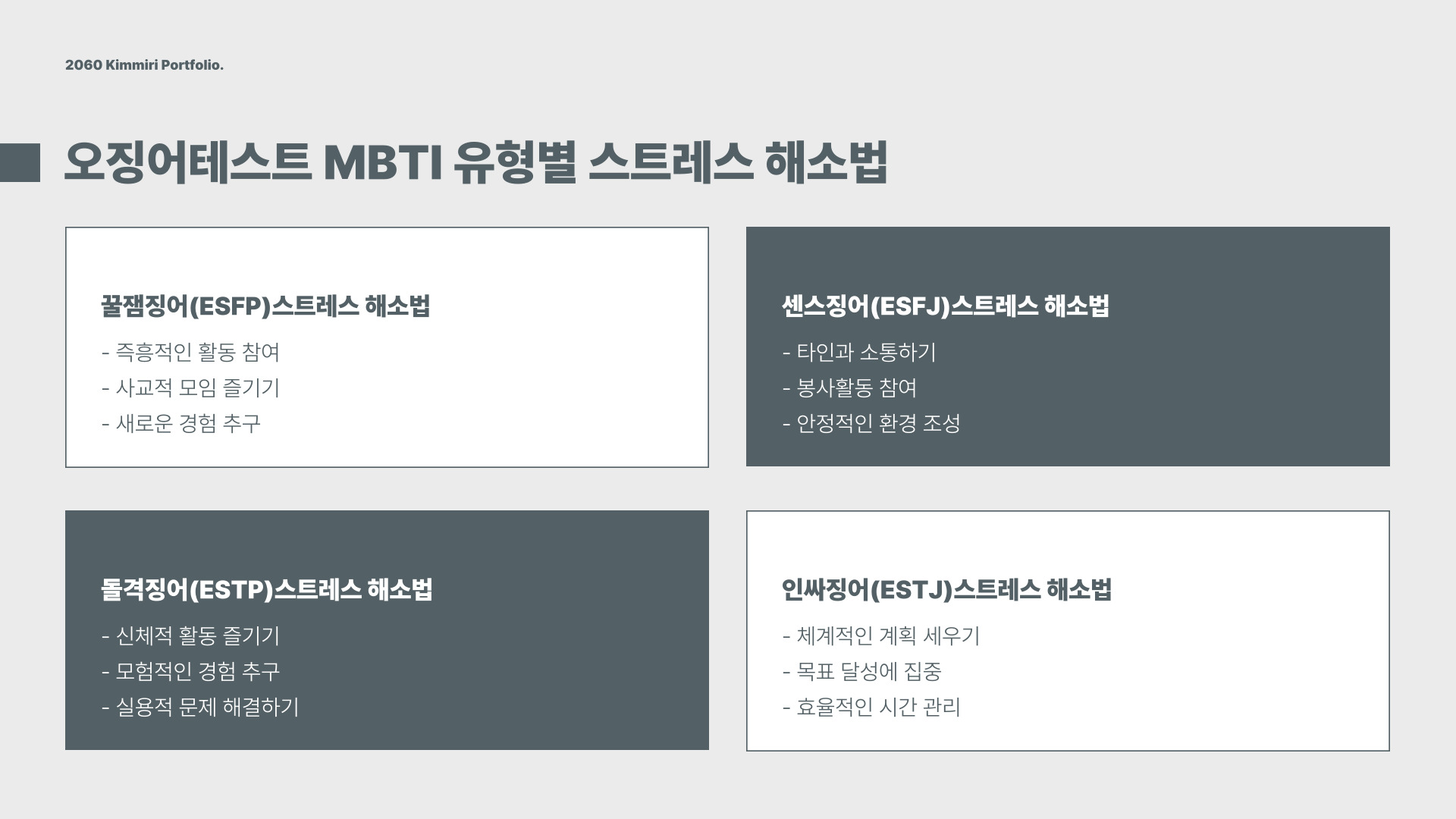 - MBTI는 개인의 성격 유형에 따라 스트레스 해소 방법이 다릅니다.