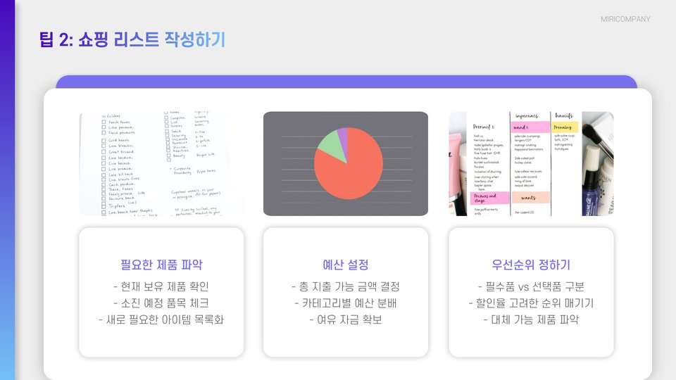 - 제품 리스트를 작성하여 계획적으로 쇼핑하기