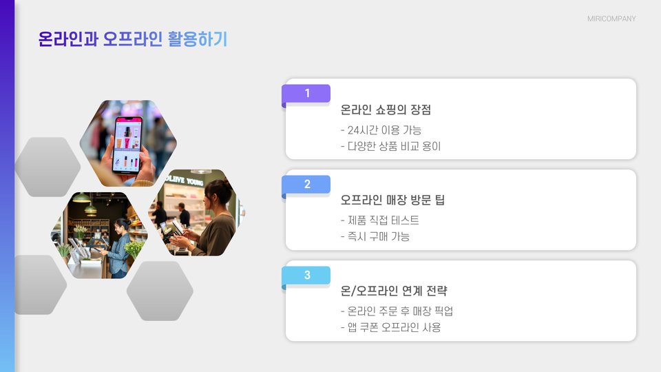 현재 올리브영은 오프라인 매장뿐만 아니라 온라인 쇼핑몰도 잘 운영하고 있습니다. 온라인 쇼핑의 장점은 여러 혜택과 편리함입니다. 특히 코로나19로 인해 많은 사람들이 온라인 쇼핑을 선호하게 되었으며, 이를 잘 활용하면 좋습니다. 오프라인 매장에서 찾기 힘든 제품도 온라인에서 쉽게 찾을 수 있습니다.