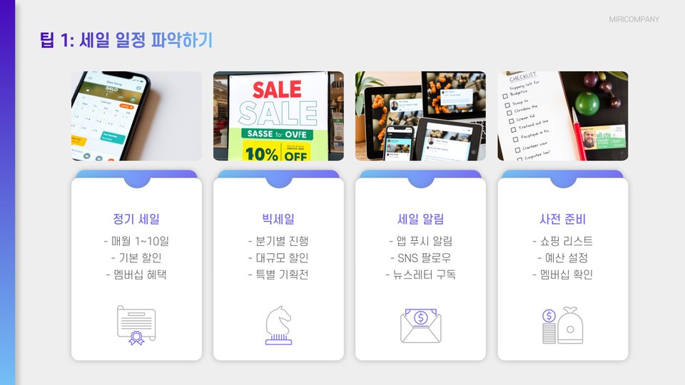또한 세일 상품은 재고가 소진되는 경우가 많으므로, 목표 제품은 빠르게 구매하는 것이 손해를 줄이는 방법입니다. 할인 제품을 놓치지 않기 위해서는 특별한 행사일정과 마감일정에 맞춰 구매하는 전략이 필요합니다.