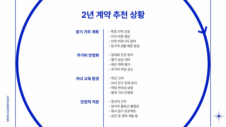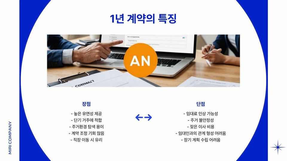 - 중기 계약(1년): 안정성과 유연성을 모두 고려할 수 있는 좋은 선택입니다. 안정적인 주거 환경을 원하지만, 개인적인 사정이 있을 경우 최선의 선택입니다.