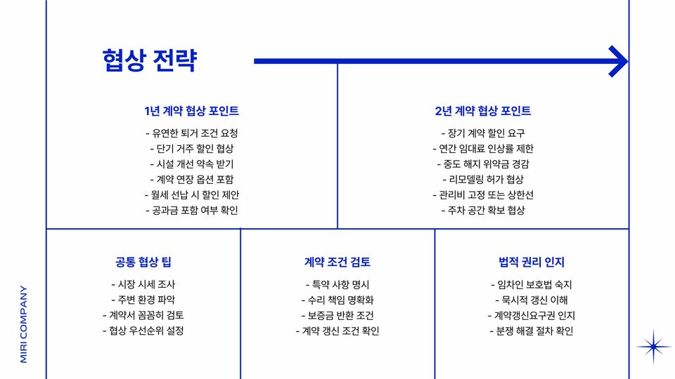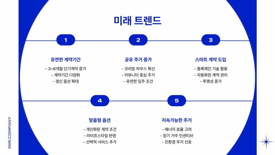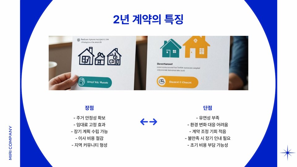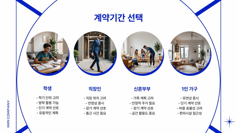 - 중기 계약(1년): 안정성과 유연성을 모두 고려할 수 있는 좋은 선택입니다. 안정적인 주거 환경을 원하지만, 개인적인 사정이 있을 경우 최선의 선택입니다.