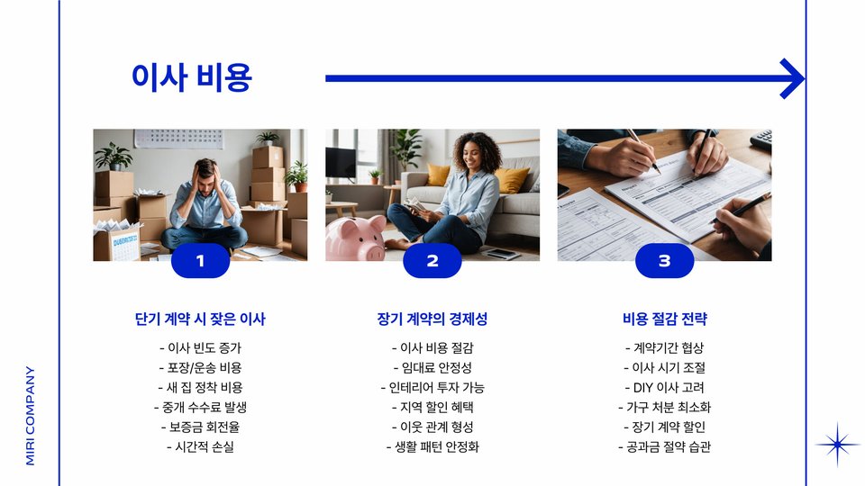 두 번째로는 경제적 부담의 감소입니다. 월세 계약 기간이 짧다면, 장기 계약보다 초기 비용이 적게 들어 경제적으로 부담을 덜 수 있습니다. 종료 후에는 더 나은 조건의 집으로 옮길 가능성도 높아집니다.