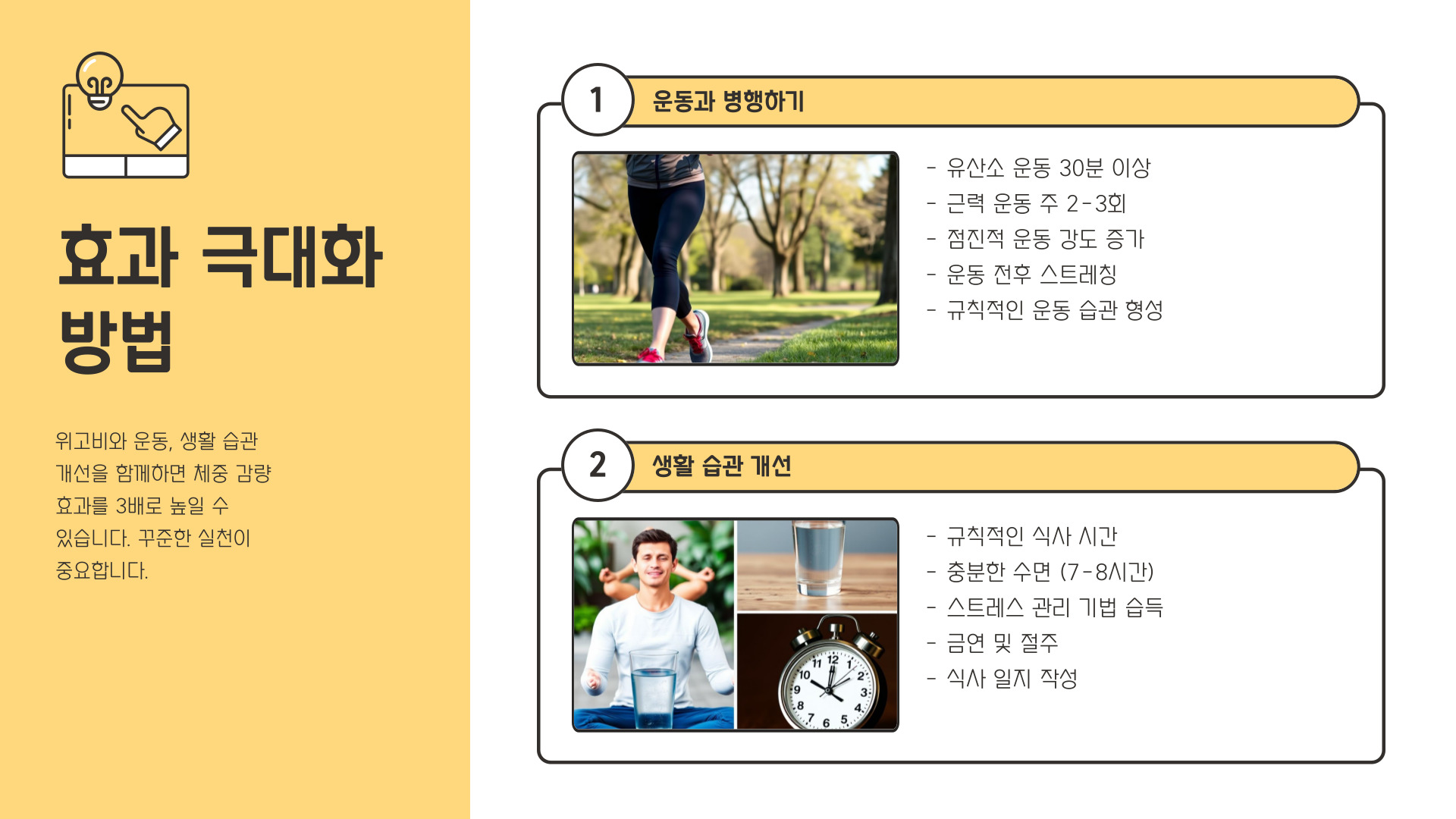 위고비 처방의 효과를 올리기 위해서는 운동을 규칙적으로 하는 것이 중요합니다. 운동은 체중 감소에 직접적인 영향을 미치며, 약물의 효과를 보완해 줄 수 있습니다. 주 3회 이상 유산소 운동을 포함한 운동 계획을 세우는 것이 좋습니다. 예를 들어, 빠르게 걷기, 자전거 타기, 수영 등 다양한 운동을 통해 체중 감소를 도울 수 있습니다.