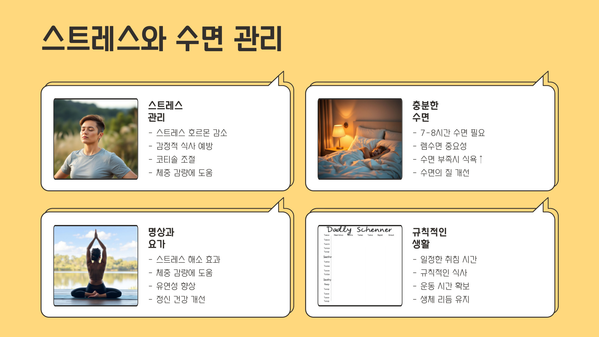 정신적 건강은 다이어트와 체중 관리에 있어서도 중요한 요소입니다. 스트레스와 불안은 체중 증가와 관련이 깊기 때문에, 적절한 스트레스 관리가 필요합니다. 명상, 요가, 또는 취미 활동을 통해 정신적 안정을 찾는 것이 좋습니다. 정신적 건강이 잘 유지되면, 음식에 대한 유혹을 이겨내기 쉬워집니다.