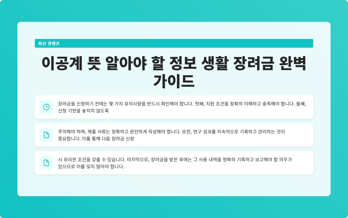 이공계 연구 생활 장려금은 연구자들의 경제적 지원을 목표로 하며, 혁신적이고 사회에 기여하는 연구 성과를 장려하는 역할을 충실히 수행하고 있습니다. 이 가이드를 통해 이공계 분야에 대한 이해를 높이고, 연구 활동을 계획하는 데 유용한 정보가 되기를 바랍니다.