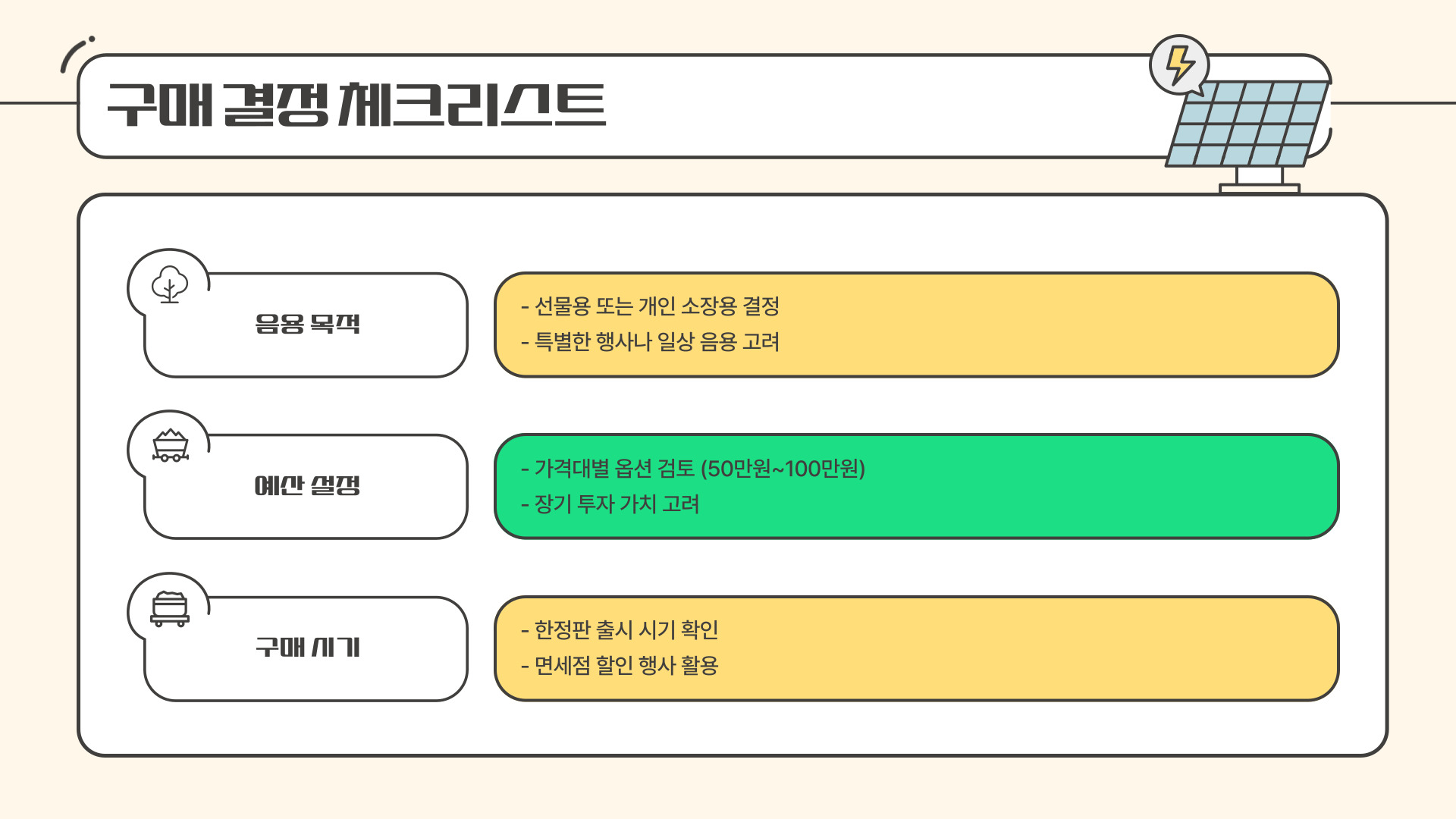 셋째, 보관 조건도 고려해야 합니다. 위스키는 온도와 습도에 민감하므로, 적절한 환경에서 보관해야 합니다. 넷째, 재판매 가치를 생각해 보세요. 위스키는 시간이 지남에 따라 가치가 상승할 수 있으므로, 장기적인 투자로서의 가치를 고려해야 합니다.