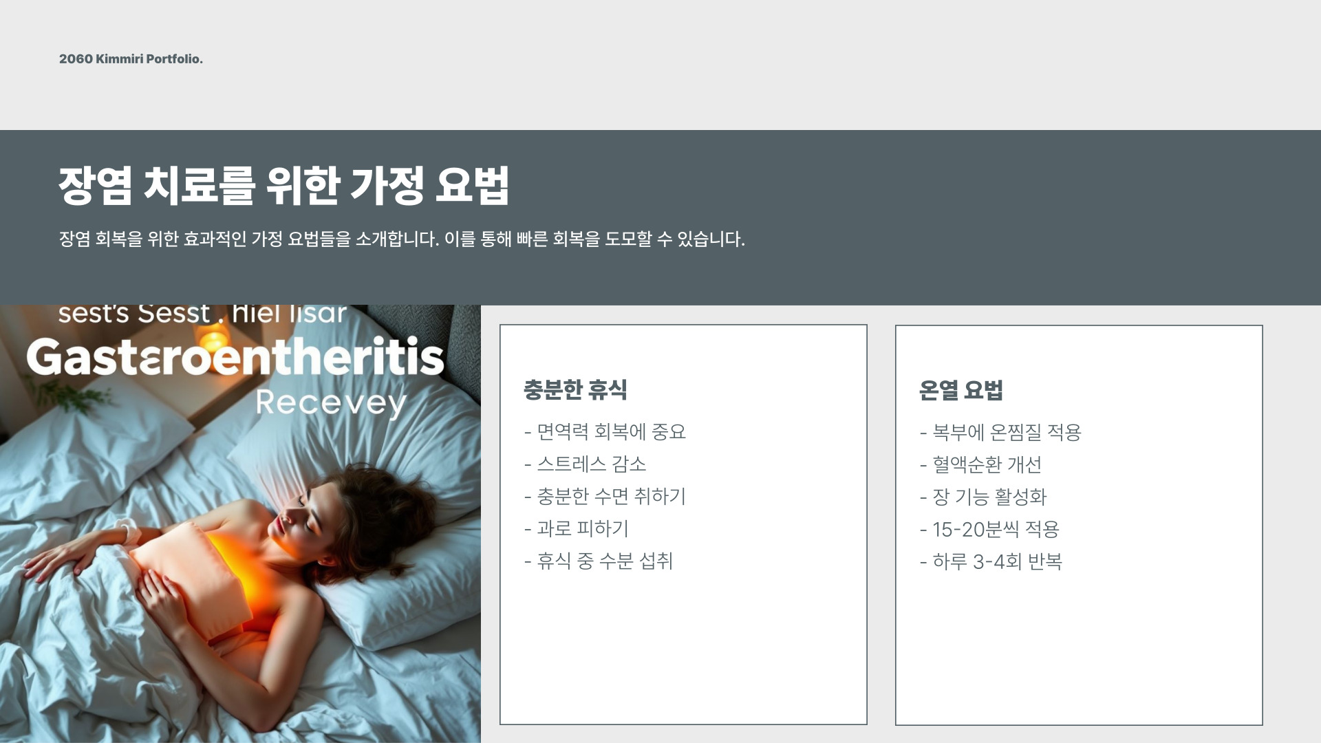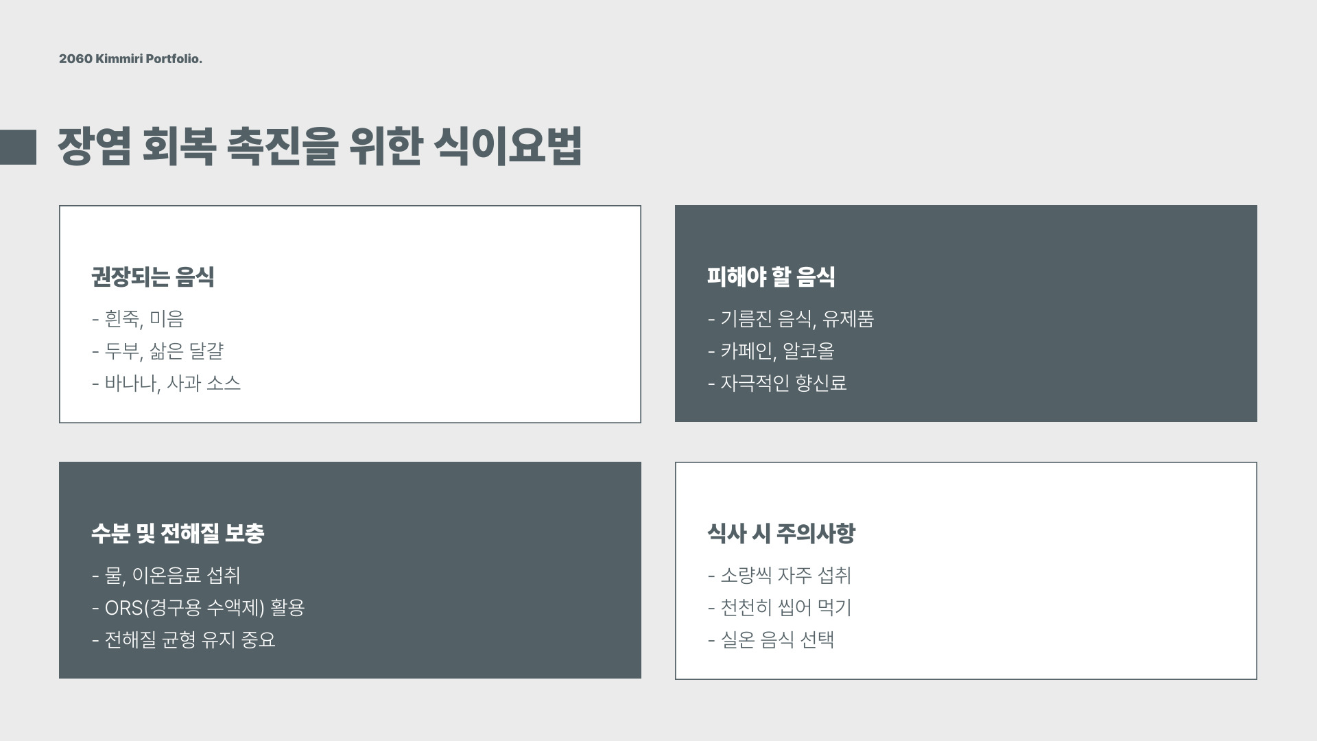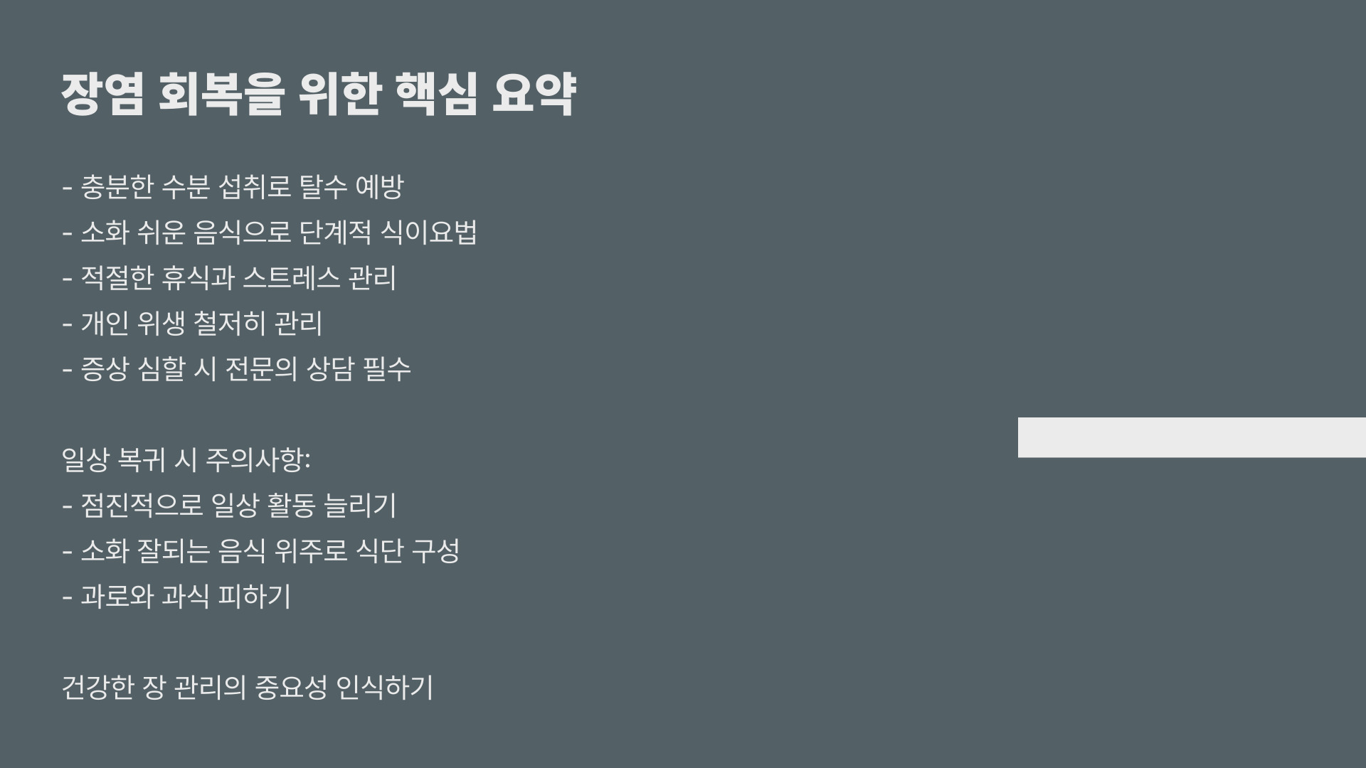 - 장염 이후 균형 잡힌 식사와 정기적인 운동이 필요합니다.