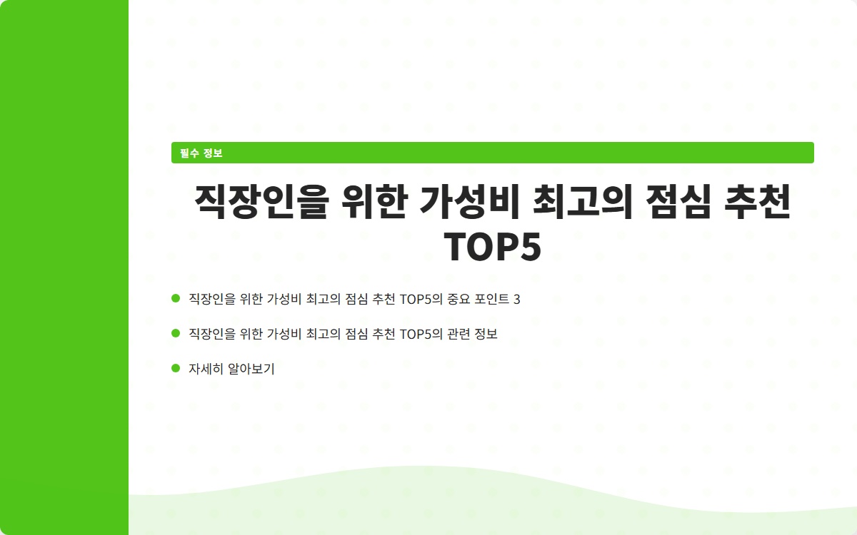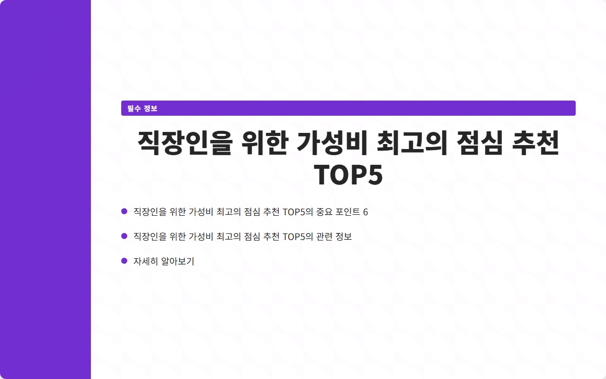 직장 생활의 바쁜 일상 속에서 점심시간은 단연코 중요한 휴식의 순간입니다. 그러나 맛있고 가성비 좋은 점심을 찾는 것은 쉬운 일이 아닙니다. 여기서는 직장인 점심 추천을 위해 최고의 가성비 메뉴 5가지를 소개합니다. 이 추천은 맛과 가격 모두를 고려하여 직장인들이 즐길 수 있는 최상의 조합입니다. 특히, 시간이 부족한 직장인들에게 빠르고 간편하게 즐길 수 있는 점심을 제안하니, 참고하시면 좋겠습니다.