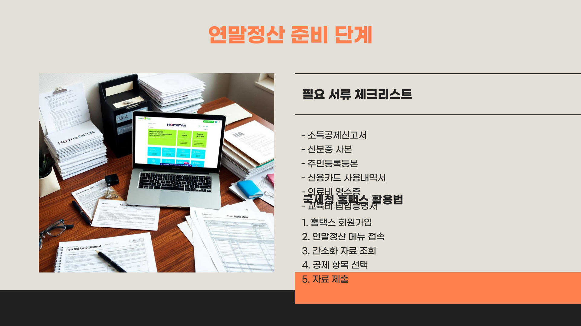 연말정산을 준비할 때는 해당 연도의 모든 지출내역을 체계적으로 정리하는 것이 체계적인 계산을 돕습니다. 특히 공제 혜택이 있는 항목들을 미리 체크하고, 관련 영수증이나 내역서를 정리하여 제출할 준비를 하는 것이 중요합니다. 체계적인 준비가 연말정산을 쉽게 만드는 열쇠입니다.