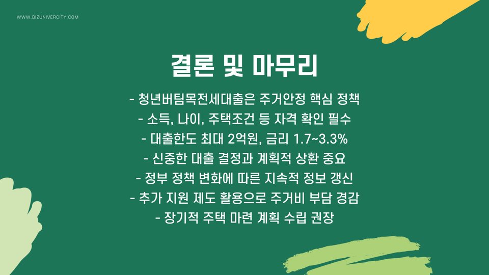 청년버팀목전세대출은 청년들에게 주거 안정성을 제공하는 중요한 제도입니다. 소득 조건과 대출 한도, 금리 등을 잘 이해하고 준비하면, 보다 쉽게 대출을 받을 수 있습니다. 따라서, 필요한 정보를 충분히 숙지하고 신청 절차에 따라 진행하는 것이 중요합니다. 청년 여러분들이 이 제도를 통해 안정적인 주거 환경을 마련하시길 바랍니다.