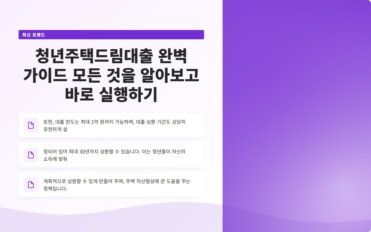 청년주택드림대출은 정부가 청년층의 주거 안정을 위해 마련한 주택 구입자금 대출 프로그램입니다. 주로 만 19세에서 39세 사이의 청년들이 이용할 수 있으며, 대출 한도는 최대 3억 원까지 가능합니다. 이 대출은 주택을 구입할 때 필요한 자금을 지원하여, 청년들이 경제적으로 부담을 덜 수 있도록 돕습니다.