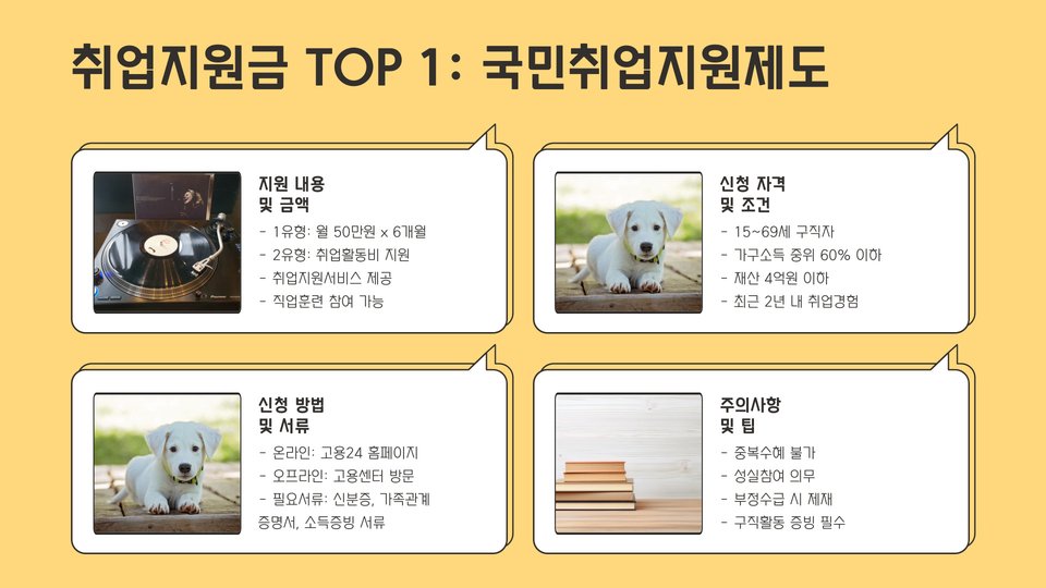 이제 청년취업지원금의 TOP 10을 소개하겠습니다. 아래는 각 지원금의 특징과 혜택을 간략히 정리한 내용입니다.