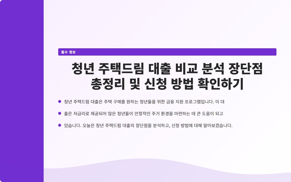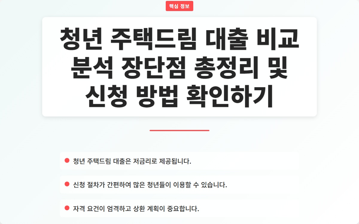청년 주택드림 대출은 주택 구매를 원하는 청년들을 위한 금융 지원 프로그램입니다. 이 대출은 저금리로 제공되어 많은 청년들이 안정적인 주거 환경을 마련하는 데 큰 도움이 되고 있습니다. 오늘은 청년 주택드림 대출의 장단점을 분석하고, 신청 방법에 대해 알아보겠습니다.