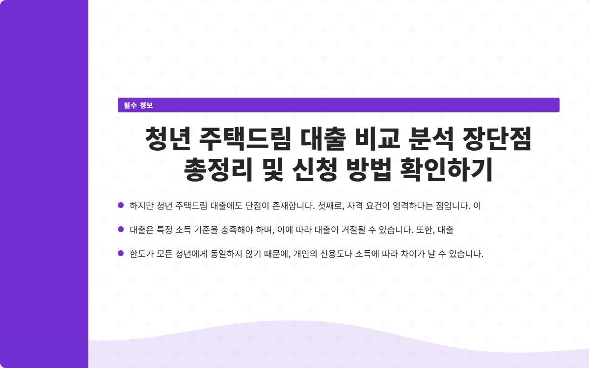 하지만 청년 주택드림 대출에도 단점이 존재합니다. 첫째로, 자격 요건이 엄격하다는 점입니다. 이 대출은 특정 소득 기준을 충족해야 하며, 이에 따라 대출이 거절될 수 있습니다. 또한, 대출 한도가 모든 청년에게 동일하지 않기 때문에, 개인의 신용도나 소득에 따라 차이가 날 수 있습니다.