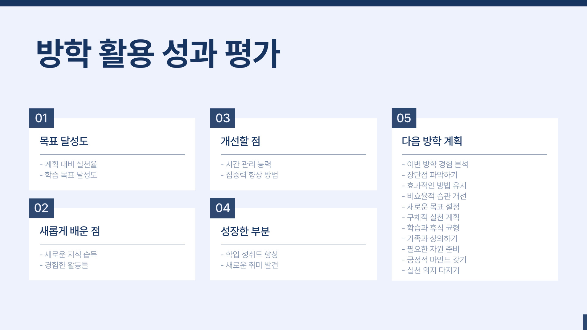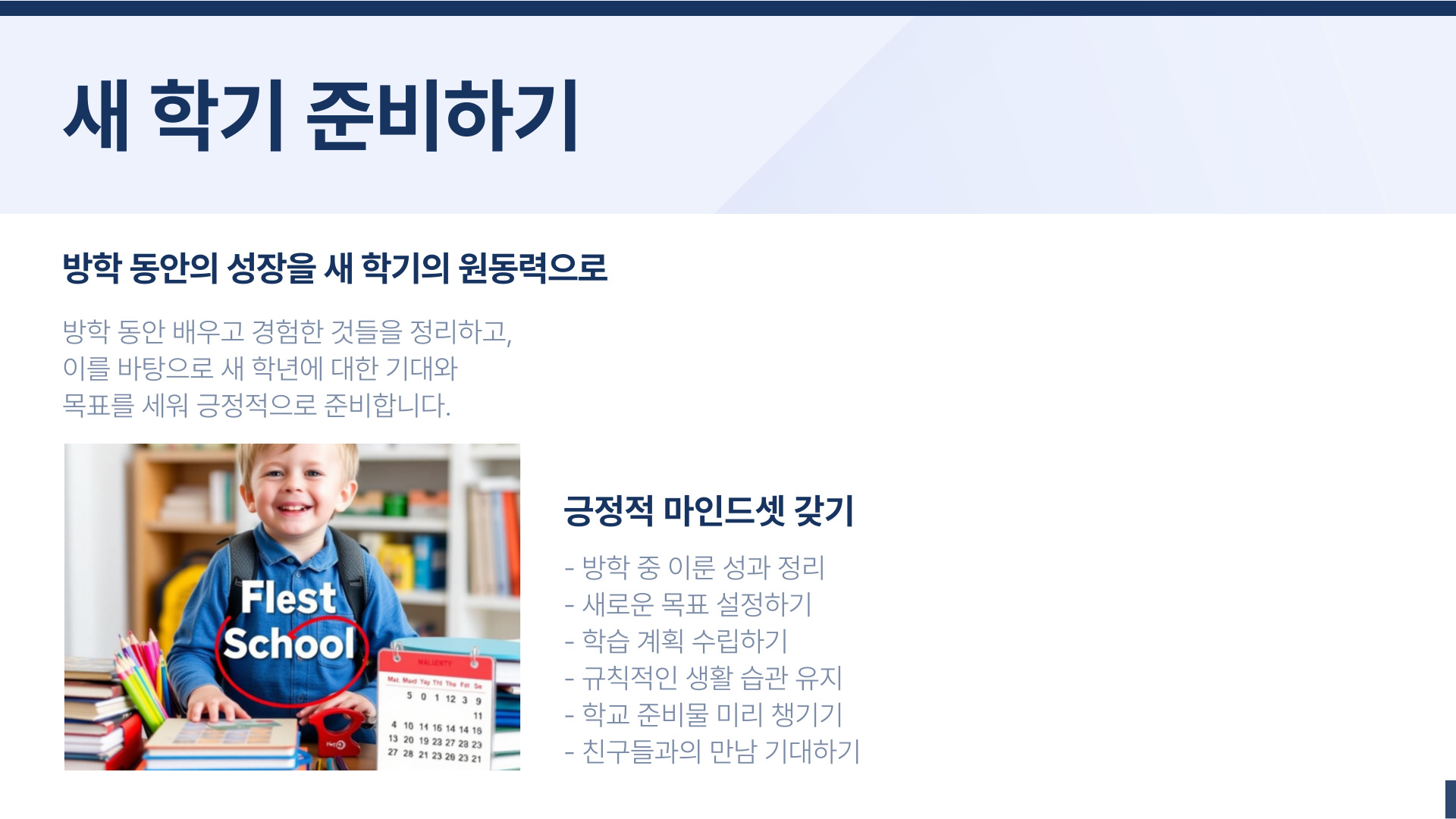 결론적으로, 초등학생의 방학은 새로운 경험과 지식을 얻는 데 매우 중요한 시간입니다. 계획적이고 체계적으로 방학을 활용하면 아이의 성장과 발전에 큰 도움이 될 것입니다. 이 5단계를 통해 방학을 더욱 유익하고 알차게 보낼 수 있도록 지원해주세요.